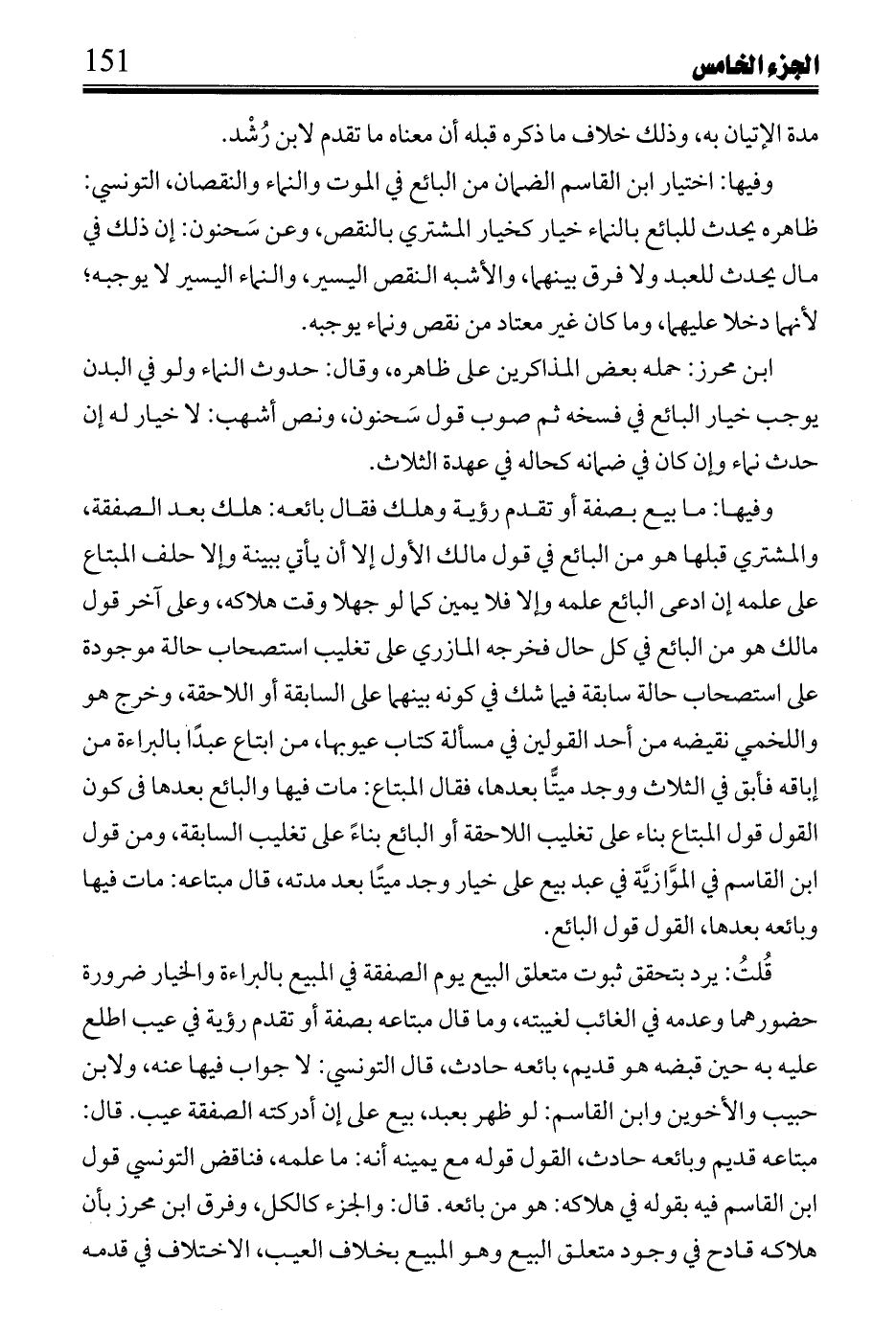 وتعليل غيره الاشتراط بأنه لا يدري هل باع منه موجودًا أم لا؟ فعقد البيع إذا وقع جائزًا كلام صحيح، وقوله: (ثم ينظر ... إلى آخره): معناه على أن الضمان من البائع صحة الأولى مطلقًا؛ لأن بيعه مبتاعه قبض له، والثانية إن قبضه مبتاعه بعد ابتياعه وإلا ضمنه مبتاعه وعلى أن المبتاع من الضمان يصحان مطلقًا، وقول ابن الحاجب وعلى تضمين المشتري لو تنازعا، فقولان لتعارض أصلى الله عليه وسلم السلامة وانتفاء الضمان يتقرر بإجرائه على ما ذكر بمسألة قولي ابن القاسم وأشهب في قول مبتاع غائب تغير عن حال رؤيته المتقدمة وكذا ذكر ابن شاس المسألة بلفظ (تنازعا) وظاهر قول ابن الحاجب يتناول تنازعهما في وقت هلاك ما هلك، وتقدم أن الخلاف فيه إنما هو بتخريج اللخمي والمازري، وقول ابن عبد السلام في تفسيره تنازعهما في نقد ثمنه، وقول ابن عبد الرحمن به، وقول ابن عبد الرحمن به، وقول أبي عمران، لا يجب قال: وظاهر قول المؤلف عموم قوليهما في كل ما ضمنه المبتاع ربعًا كان أو غيره، وابن عبد الرحمن نص على قصر قوله في الربع فقط واضح البعد، والوهم مع يسر تفسيره بما تقدم، ومن نظر وأنصف علم ذلك والله أعلم بالصواب.