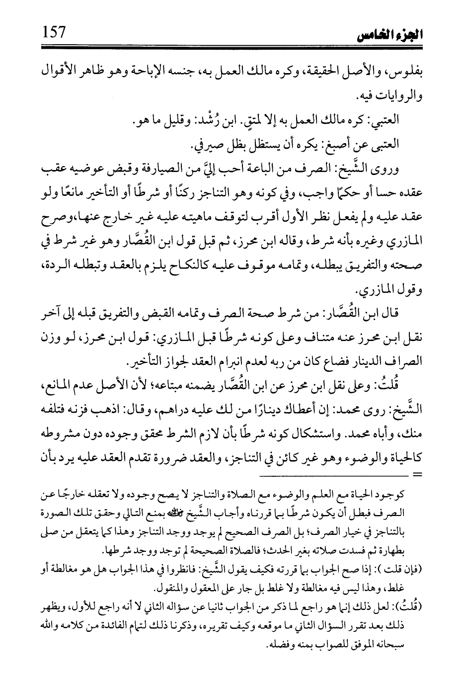 ابن عبد الرحمن، وابن رُشْد: مؤثر لظاهر الروايات مأولين رواية القلادة بيسارة الذهب وأولها ابن زرقون بفوتها: ولزمه الثمن دون القيمة لتهمة مدعي فوتها إسقاط فضل الثمن عليها كضمان مبتاع ثوب بخيار أتلفه وسبقه المازري بحكايته، وقال: هذا تعسف وروى محمد: تأثير تأخيرهما لليل غشيهما.