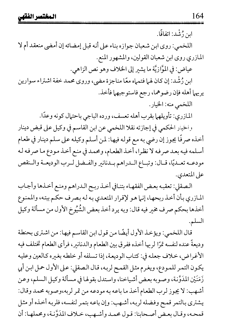 وعزا الباجي الأول لرواية محمد بزيادة لضمان المرتهن قال: وعليه يجوز في العارية، وذكر اللخمي الثلاثة في الوديعة قال: ولو شرطا ضمانها من ربها حتى يقبضها المودع لم يجز، ولو شرطا عكسه، جاز اتفاقًا فيهما، والخلا حيث لا شرط، وقبله المازري ولم يذكر غير قولي ابن القاسم وأشهب، وخرجهما على وقف انتقال ضمانهما على قبضهما، وحصوله بالعقد، وعزا الباجي الأول لرواية أشهب قال: فرأى أنه لما كان للمودع سلفها صح أن ينعقد ذلك عند الصرف فتتعلق بذمته، ويجب عليه منعه في الحلي اتفاقًا، وذكره المازري وقال: ما خرجنا عليه الخلاف يوجب التسوية في