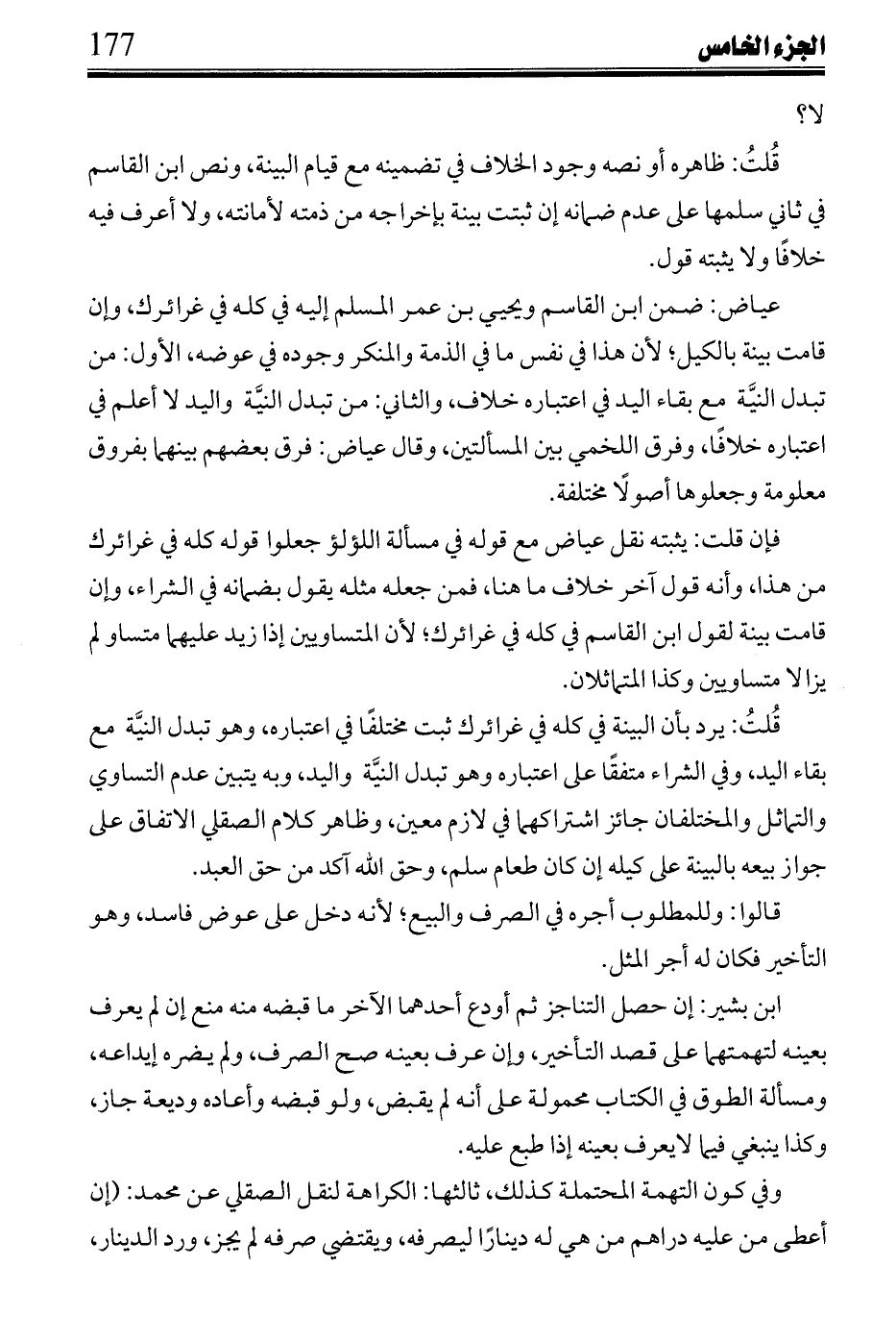 انتقض الصرف خلاف نقل ابن الكاتب عنه، وإن حملت على الطول كان قول أشهب فيها لزمه إعطاء مثلها خلاف نقل ابن الكاتب اتفاقهما بعد الطول على بطلانه، وإن قيد قول ابن القاسم بما بعد الطول، وقول أشهب بالقرب لم يكن بينهما خلاف، وقد نص ابن الكاتب على الخلاف بينهما، وقول ابن القاسم فيها أولًا انتقض الصرف، وقوله ثانيًا لا بأس أن يعطيه مثلها متناقض إن حمل قوله فلا بأس على عدم توقفه على رضاه مع جواب المازري.