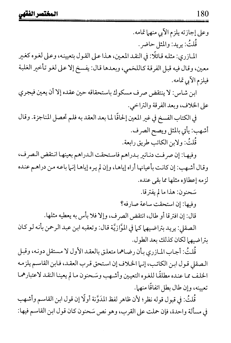 ابن محرز: هذه تدل على عدم شرط إحضار نقد الصرف وتعيينه وبطلان تعليل مسألة السلف باقتضاء الصرف التناجز فهو كشرط عدم المقاصة، وتعليله بعضهم بأن المناكرة تقتضي الطول المبطل للصرف، أجنبي عما سئل عنه؛ لأنه عن حق آدمي لا حق الله تعالى.