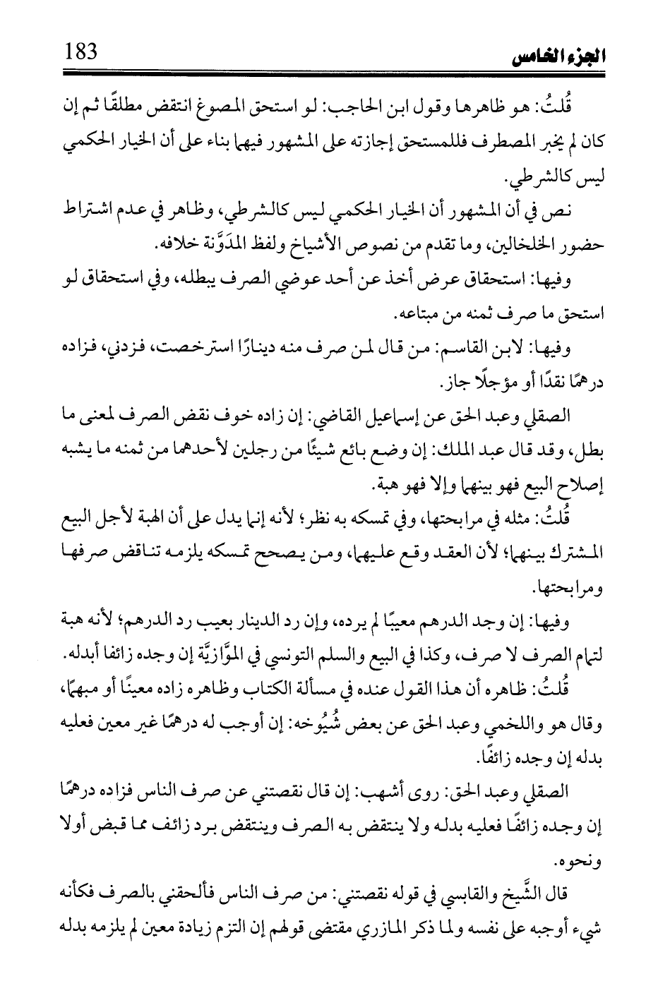 اللخمي: رأى بعض شُيُوخي أن القياس جواز تأخير السلعة كما لو انفردت وأبقى البيع على جواز تأخيرها فيه والصرف على لزوم مناجزته. قال: البيع للصرف كما لم يرد للبيع، وضعفه المازري بأن التحريم يغلب على التحليل المقارن له في عقد، ويرد بأن ذلك فيما ثبتت حرمته، والبيع مع الصرف ليس حرامًا، وإن أراد بالمحرم تأخير المبيع فهو مصادرة. والحق لزوم قول السيوري: إن كان الصرف تابعًا ومعروف المذهب في عكسه للغو حكم التابع المنافي حكم متبوعه.