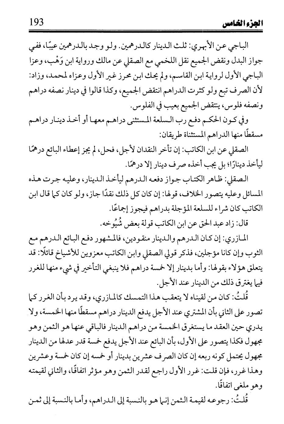 وفيها: إن ابتاعها بخمسة دنانير إلا درهمًا أو درهمين فنقد أربعة دنانير وتأخر الخامس والدرهم أو بالعكس لم يجز إذ للدرهم في كل دينار حصة نوقض لفظ تعليلها بقولها لا ينقض لزائف من صرف دنانير إلا دينار؛ لأن الدرهم إن كان له في كل دينار حصة وجب نقض جميعها في الزائف وإلا كذب التعليل، يجاب بأن الشيوع في هذه لاختلاف الدنانير بالنقد والتأخير فلا تماثل لها، وهي في مسألة قصر الزائف على دينار متماثلة ولو اختلفت، نقض الجميع.