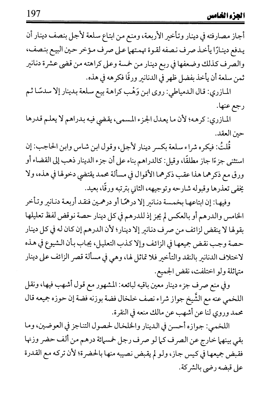 وفي كون الدينار كالحلي ومنعه فيه فتوى ابن عبد السلام وابن قداح، وقال فيما أخبرني ثقة عنه حين ذكرت له فتوى ابن عبدالسلام: الله حسيبه مرتين. وأخذه ابن عبد السلام من قولها في الحلي أخذا أحرويًا، وقال: لأن قطع الحلي يجوز بخلاف الدينار، ونحوه قول أبي حفص: يجوز في الدنيا والحلي للضرورة، وقد يفرق بأن الحلي يراد لعينه وصياغته، وكذا النقرة لغرض في عينها؛ لأنهما لو استحقا ثمنًا فسخ البيع بخلاف الدنيار، ولذا قال في إجازته في الحلي: إنه لموضع استحسان، وذكر اللخمي في الدينار الجواز كأنه المذهب، وقيل: كان طبقة شُيُوخ ابن قداح كالشَّيخ الفقيه الشهير أبي محمد الزواوي، والشَّيخ الفقيه الأصولي أبي القاسم بن زيتون كانوا يفتون بالمنع، وإن ابن قداح كان يفتي بالجواز حتى ذكر له ذلك فرجع عنه للمنع.