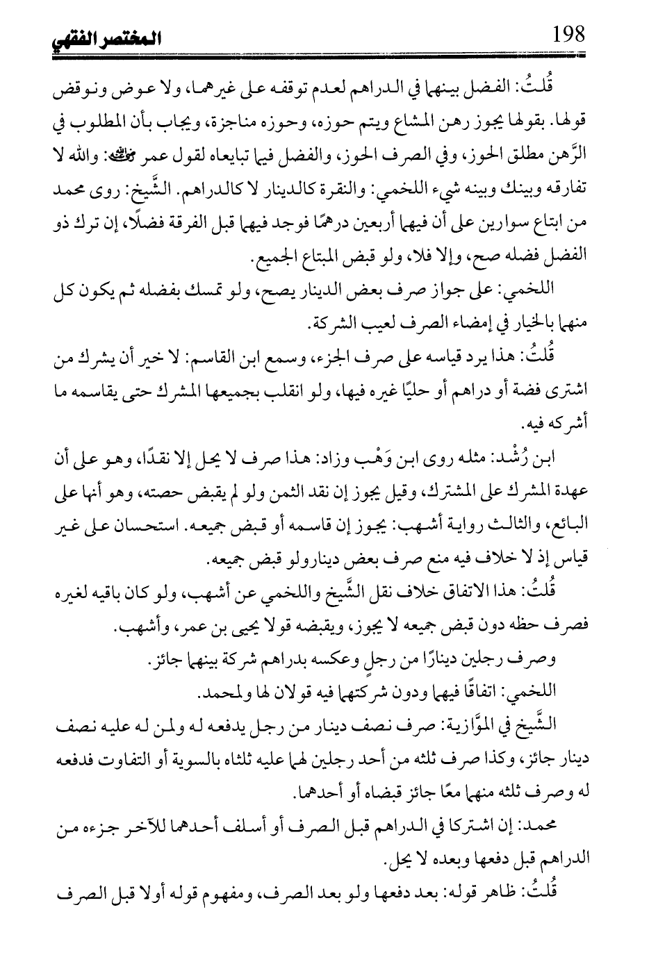 وفي جواز شراء غير ذهب وفضة ببعض درهم وأخذ باقيه فضة، وإن كان أكثر من نصف الدرهم ومنعه مطلقًا أو فيما زاد على الثلث، ورابعها: فيما زاد على النصف لنقل التونسي مع صاحب الأمر المهم قاصرًا ما زاد على النصف على ثلاثة أرباع مضعفًا له، والمازري مع الصقلي عن سَحنون، وأخذه بعضهم من قولها أصل قول مالك: لا تجوز فضة بفضة مع أحدهما أو مع كل منهما سلعة ولو كانت الفضة أكثر، واللخمي عن محمد عن ابن القاسم مع أشهب قائلًا: وأخذ ببقيته صغارًا واللخمي مع غيره عن مالك مع ابن القاسم.