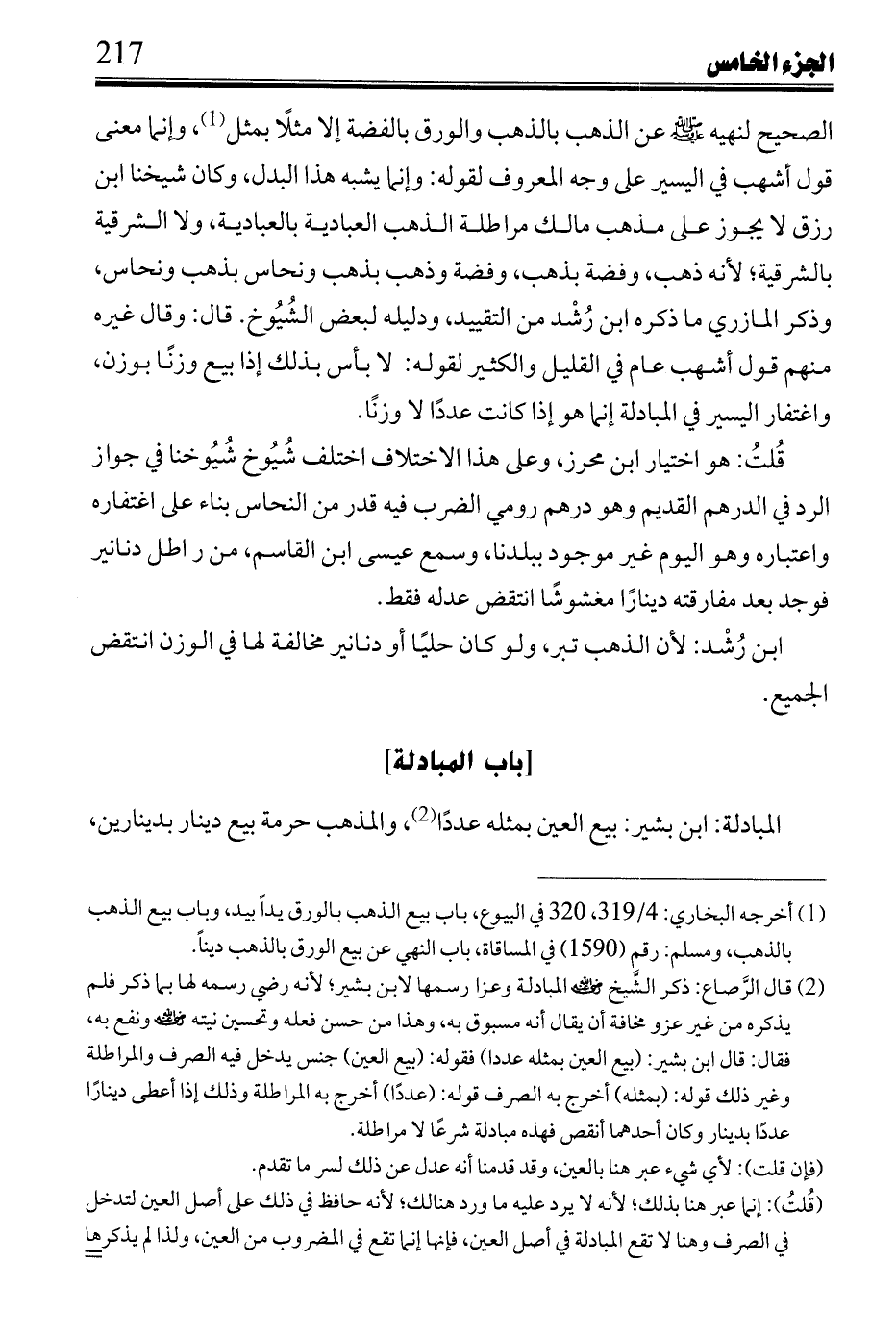 المازري: وشرط بدل الناقص بالوازن اتحاد العدد لا يبدل دينارًا بدينارين.