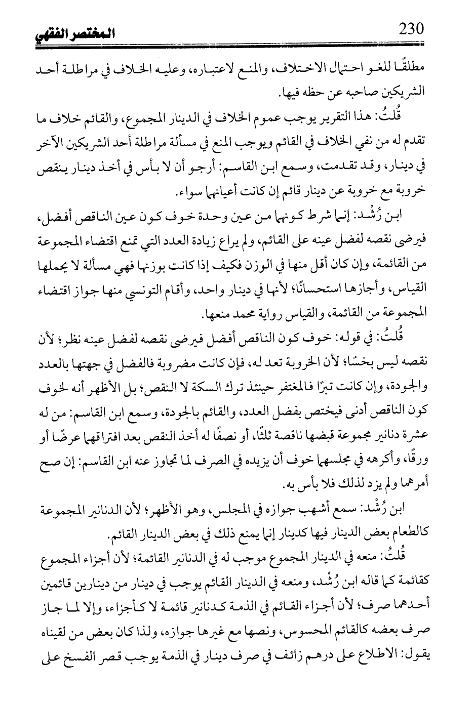 ابن رُشْد: قال محمد: ما كرهه هو عندي خفيف؛ لأن من اشترى وزنًا من شيء بعينه فلم يف به، لم يجب على البائع إتمامه ووجبت المحاسبة، وكذا قال فضل: لا معنى لكراهته، ومعناه عندي أنها تأتي على رعي ما ثبت في الذمة ذهبًا؛ لأنه اقتضاء مجموع بالميزان من قائم لا ميزان فيه.