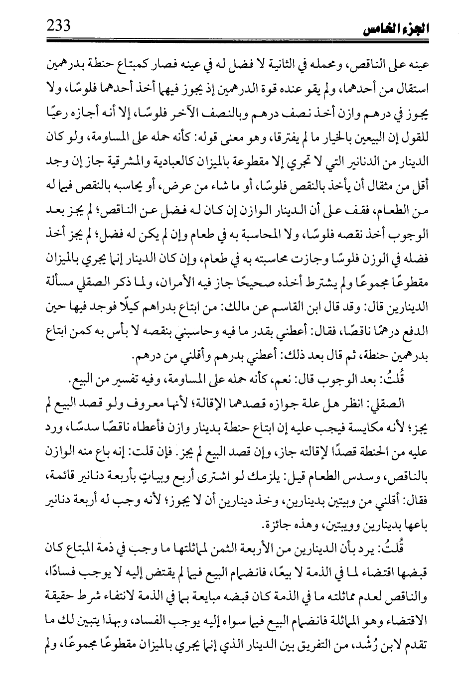 ابن رُشْد: لو أعسر المبتاع بما زاد على نصف دينار جبر البائع على أخذه منه نصف دراهم، بخلاف أن لو كان أصل بيعه بدينار قائم، وذكرها اللخمي عن محمد واستدل بها على قوله: يجبر من له نصف دينار على أخذ دينار شركة بينهما، ويرد بأن الجزء إنما قضى به دراهم لدفع ضرر الشركة، وعدم الاستقلال المقتضي بحقه،