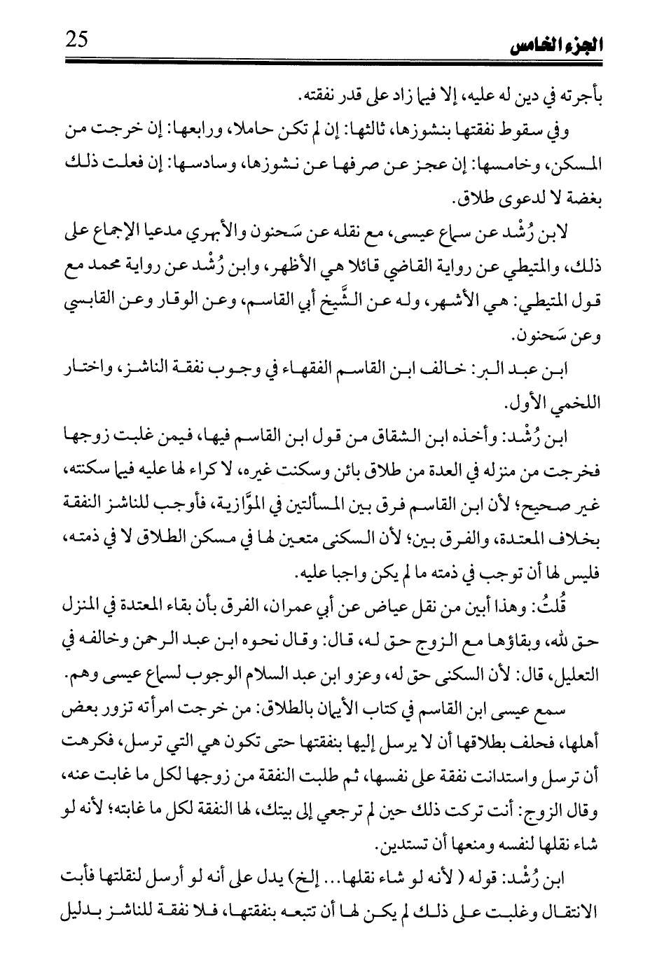 ابن عبد البر: خالف ابن القاسم الفقهاء في وجوب نفقة الناشز، واختار اللخمي الأول.