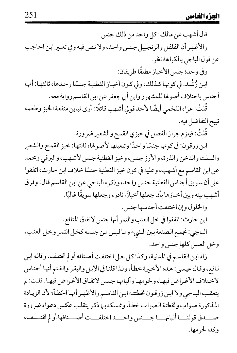 التمر ونبيذ الزبيب صنفان تبعًا لأصولهما، وعند أبي الفرج أنهما صنف واحد وهم، وفيها لمالك: لا يصلح نبيذ التمر ونبيذ الزبيب إلا مثلًا بمثل.