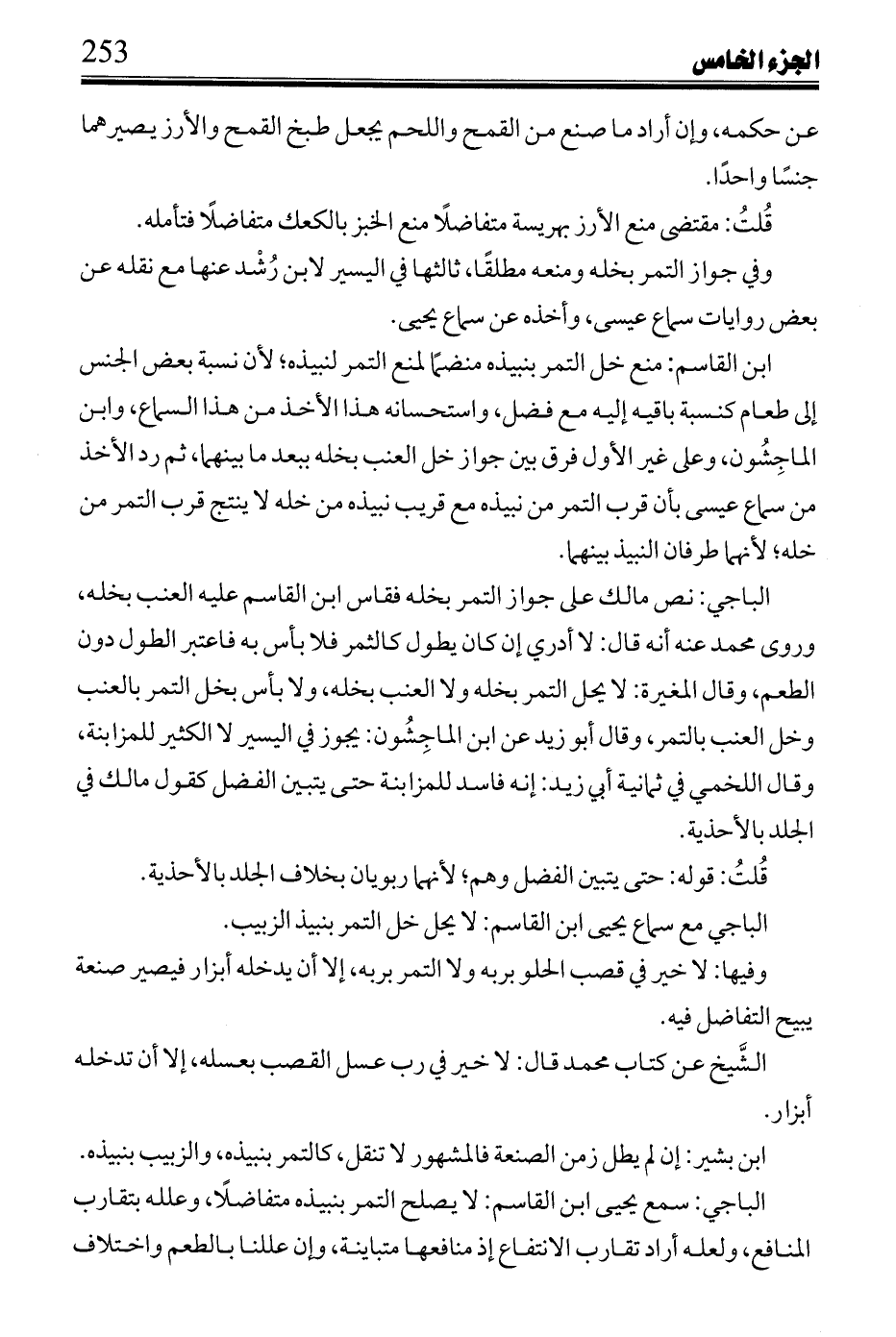 ابن رُشْد: وهذه زيادة على ما في المدَوَّنة؛ لأنه أجاز السكر بقصبه وبربه وعسله لبعد ما بين السكر وبينها، وجعل القصب وربه وعسله جنسًا واحدًا، إلا أن يدخل بعضها أبزار فيجوز التفاضل بينه وبين ما لم يدخله منها.