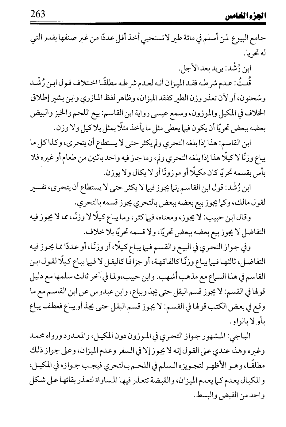 وقال ابن دحون: المساواة في الخبز بالوزن؛ لأنه صار صنفًا على حدة فوجب لغو أصله، قال: ولو جاز ما قال لفسد أكثر البيوع، ولعمري أن لقوله وجهًا، وهو القياس على الأخلال والأنبذة، المراعى قدر العوضين لا ما دخل في كل منهما من تمر أو زبيب أو عنب، وعلى دقيق القمح بدقيق الشعير، المراعى قدرهما لا أصلهما، ومعلوم أن ريع الشعير لا يساوي ريع القمح، والحجة له بالأنبذة والأخلال أبين، لاختلافهما فيما يضاف إليهما من الماء والدقيق لم يضف إليه شيء وريعه بعضه قريب من بعض.