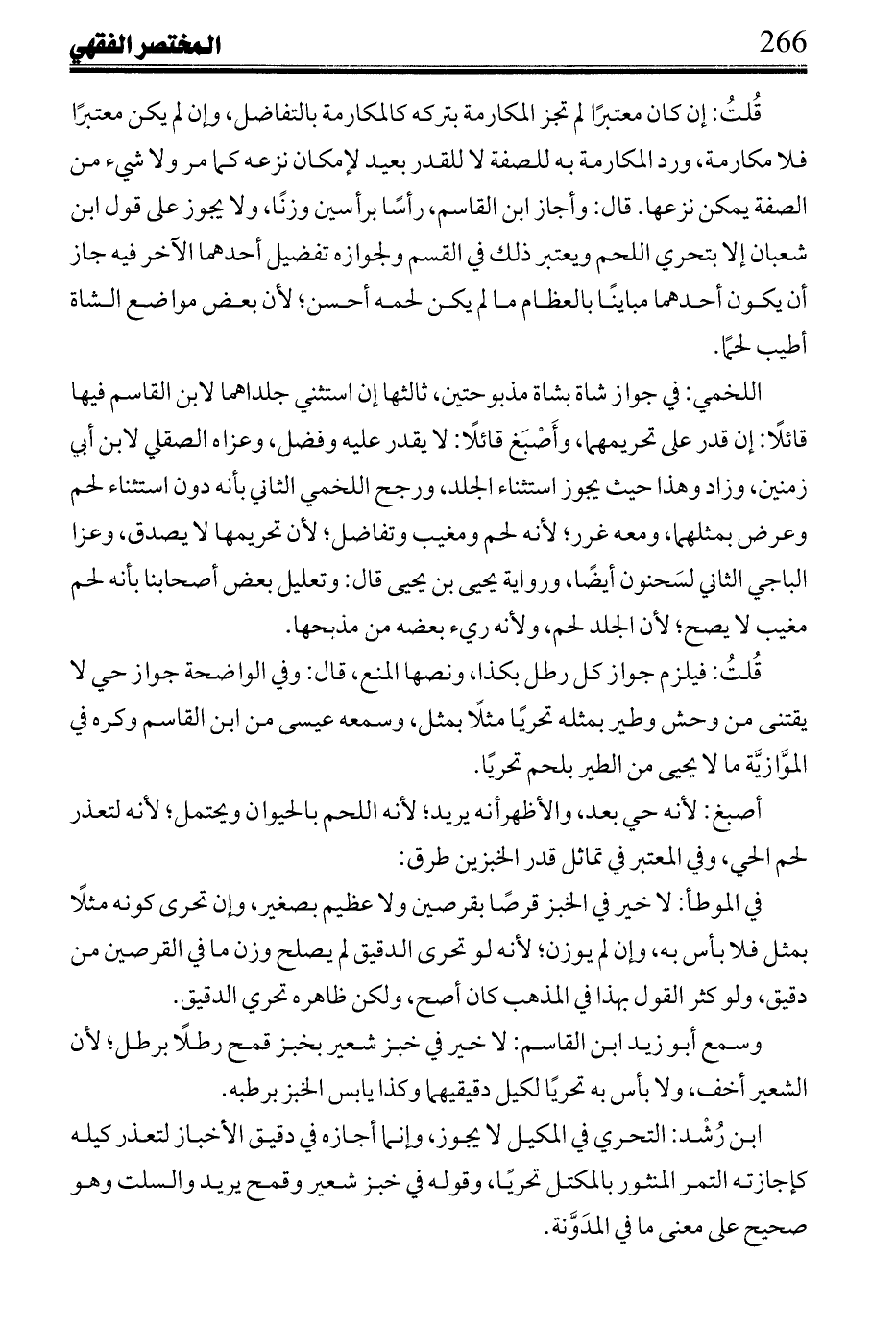 قُلتُ: يرد بأن المزابنة إنما تعتبر في الجنس الواحد فدخولها في اللحم بالحيوان يصيرهما جنسًا واحدًا، وذلك برد الحي لجنس اللحم لأنه المناسب للمنع لا العكس؛ لأن حكمه الجواز وإذا كان كذلك لزم المنع، ولو بان الفضل؛ لأن الجنس حينئذ ربوي بخلاف الكتان والجلد، وقوله عن ابن القاسم: إذا سلم أن المنع لأجل المزابنة جاز إذا كان الحي مرادا للقنية مع نقله عنه أنه منعه جملة خلاف المنصوص في أصول الفقه وعلم النظر، أن المجتهد إذا عين علة حكم مع نصه على نفيه في صورة معينة فيها تلك العلة أنه لا يصح تخريج ذلك الحكم في تلك الصورة؛ لأن دلالة لفظه على نفيه عنها نص خاص، ودلالة العلة كلفظ عام، والخاص مقدم على العام ومأكول اللحم مما يقتنى له حكم نفسه مطلقًا، وما لا يقتنى، وتقصر حياته كطير الماء في كونه مع طعام غير جنس لحمه أو مع حيه المقتنى كمقتنى أو كلحم نقل اللخمي عن أشهب ومالك مع الباجي عن ابن القاسم، ومع حي جنسه كحيً لا يجوز له اتفاقًا دون تحر، وفيه تحريًا، ثالثها يكره للخمي عن محمد عن ابن القاسم، وعن إجازته في العتبيَّة طيرًا لا يستحيى بمثله تحريًا مع رواية محمد، الرجوع عن كراهة (...) النعم وكبيرها الذي للذبح بلحم لجوازه تحريًا، وابن القاسم ابن رُشْد: أشهب يراعي حياته فلا يجيزه بلحم صنفه بحال.