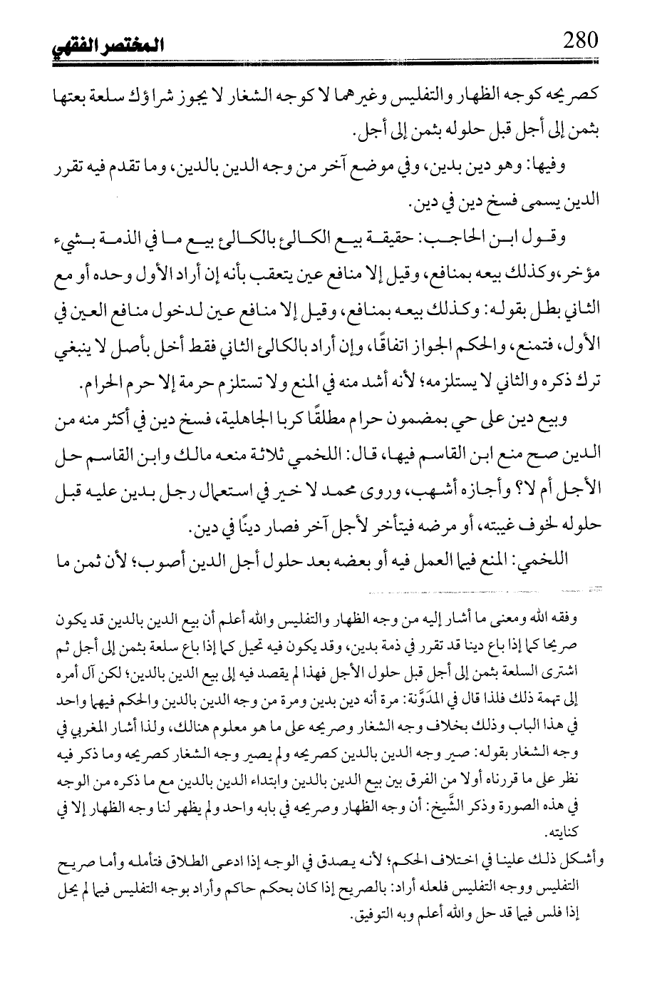قُلتُ: ظاهر المذهب في منع السلم الحال منعه، ولو كان المثل عنده، وإنما يصح قول التونسي على صحة تأويل بعض الشُيُوخ ما وقع في المدَوَّنة مما يدل على السلم الحال، بكون المثل حاضرًا عند البائع، قال: ولو كان قرض السلعة لشهر جاز بيغها من مقرضها بثمن نقدًا، أو بدراهم إلى ثلاثة أيام، ولو كانت إلى عشرة أيام لم يجز؛ لأنه دين بدين.