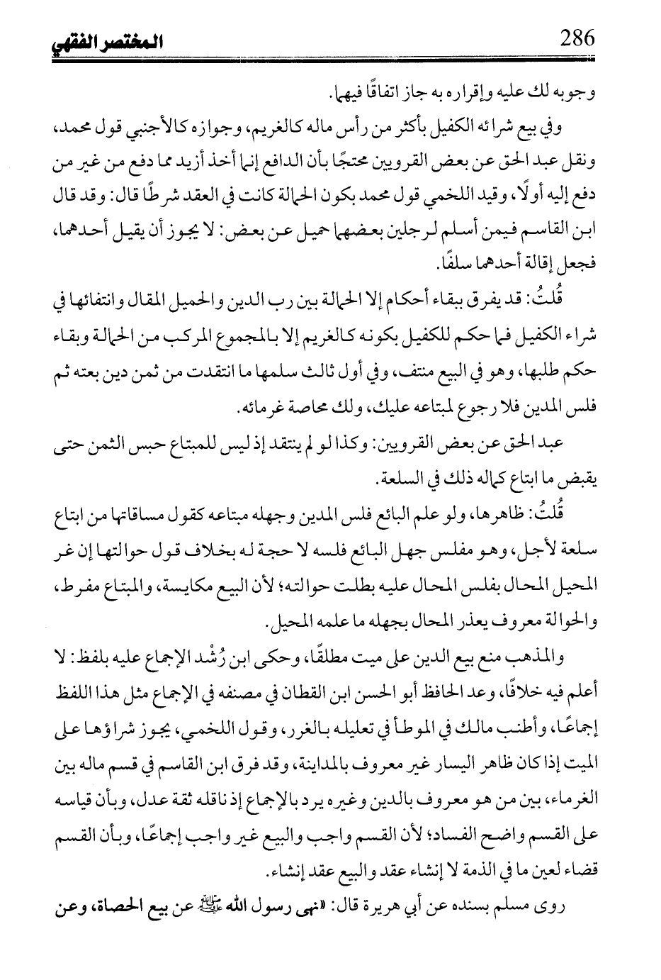 قُلتُ: زاد في رسم الشريكين من سماع ابن القاسم من جامع البيوع وكل هذا في الحيوان الذي يزيده الحمل، ويجوز في الجارية الرفيعة التي ينقصها الحمل على أنها حامل إذا كانت ظاهرة الحمل؛ لأنه تبر من عيب حملها كسائر العيوب.