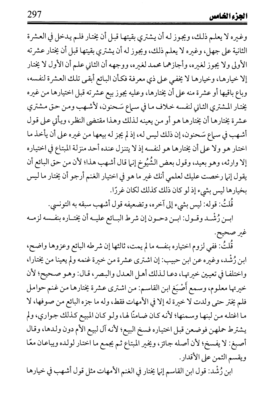 قُلتُ: كذا رأيته في اختصار الواضحة، قال فضل إثر نقله: انظره مع قوله في الغنم: لا يجوز أن يشترط خيار أكثرها.