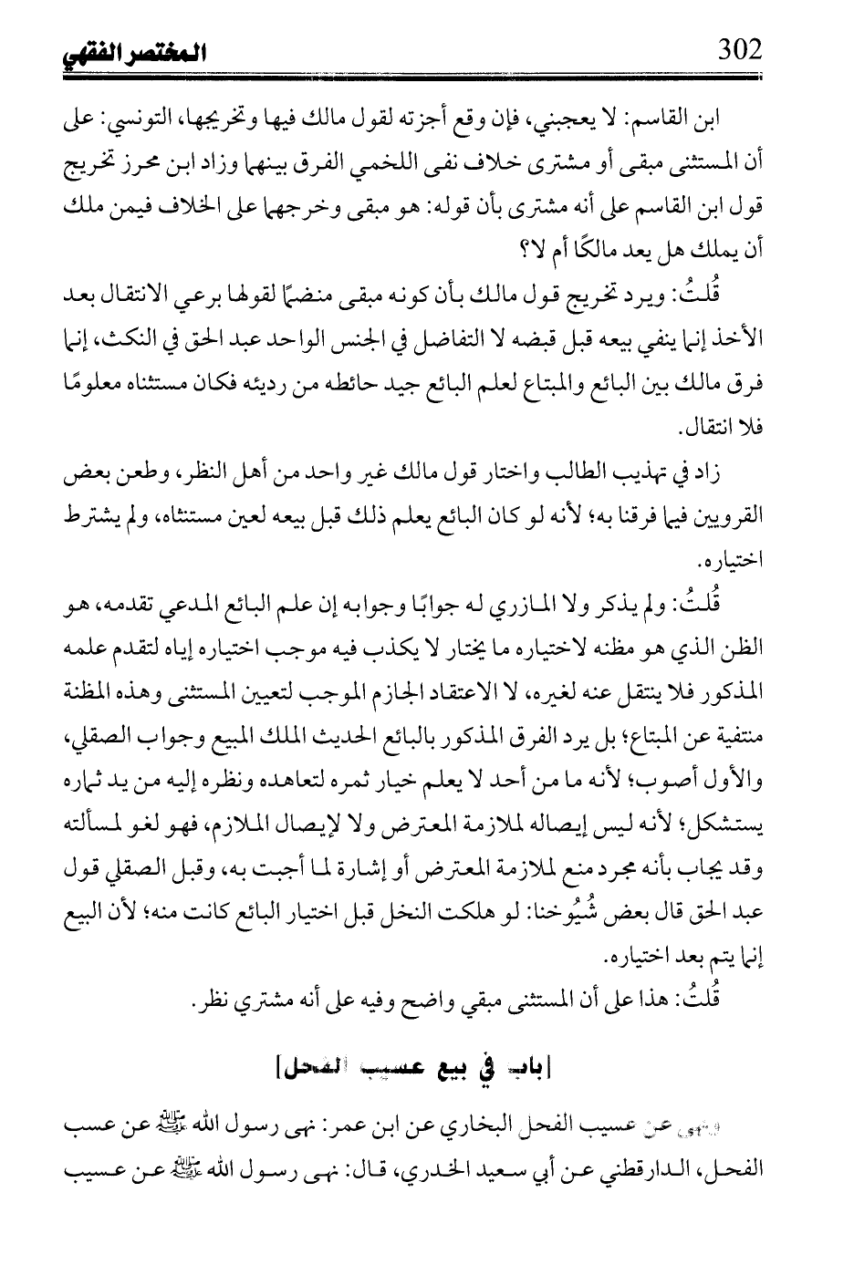 والثاني: إما من مقتضاه أو لا فالأول فيه قول ابن رُشْد في المقدمات في بيوع الشروط المسماة عند العلماء: ببيوع الثنيا كالبيع على أن لا يبيع ولا يهب ولا يخرج بها من بلد أو أن يتخذها أم ولد أو على أن لا يعزل عنها أو لا يجيزها البحر، أو على إن باعها فهو أحق بها الثمن أو على أنه بالخيار فيها لأجل بعيد لا يجوز الخيار إليه، وشبهه من شروط التخيير على المشتري خلاف، قيل: يفسخ مطلقًا، وفي فوت السلعة قيمتها ما بلغت والمشهور يفسخ ما لم يترك، ذو الشرط إن تركه صح البيع إلا في شرط ما لا يجوز من أمد الخيار فيلزم فسخه لامتناع تحقق إسقاط الشرط لجواز كون إسقاطه أخذا به.