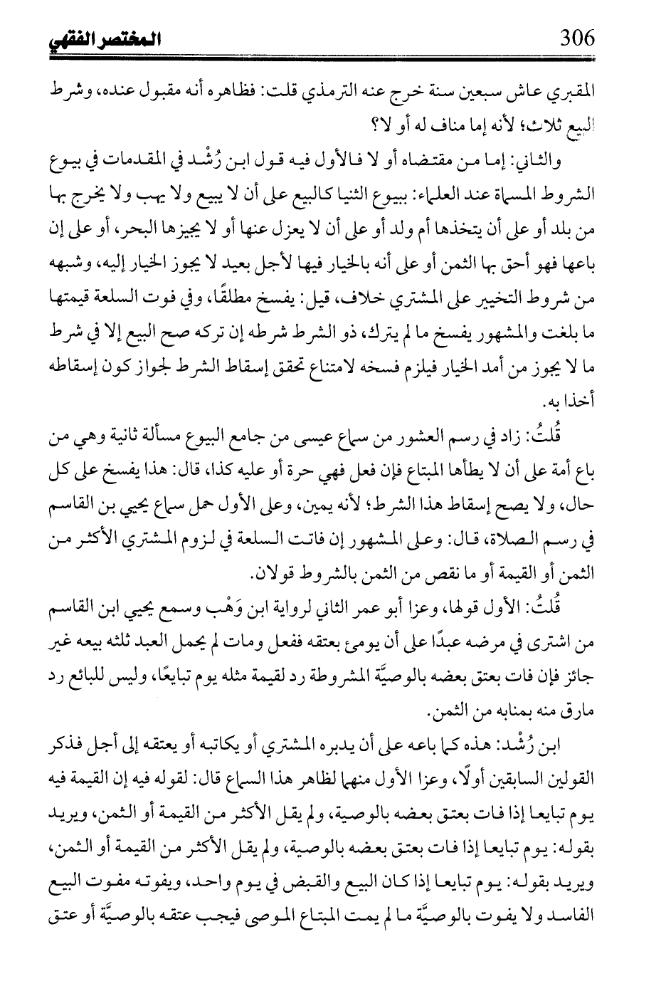ابن رُشْد: هذا من بيوع الثنيا التي المشهور فسخها ما لم تفت إلا أن يسقط البائع شرطه، فإن فات ففيه الأكثر من القيمة أو الثمن، وقوله هنا: يفسخ في القيام وفي فوته قيمته يوم قبضه، وهو معنى قوله: البيع ماض عليه بفوتها خلاف مشهور قوله.