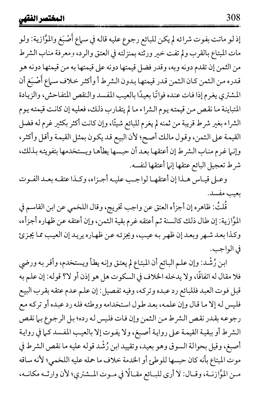 في البيع بشرط أن لا بيع إن لم ينقد إلى أجل قريب في فسخه، وتمامه بشرطه وتمامه بإبطاله، رابعها يوقف المشتري إن نقد مضى وإلا رد لابن حارث عن ابن مسكين عن روايات ابن القاسم للثلاثة ونقل عياض، وعزا الثلاثة لروايات ابن لبابة، وعلى الثالث في جبره على النقد عاجلًا أو أجل، ثالثها إن قال: إن جئتني بالثمن وإلا فلا بيع بيننا، وإن قال: إن لم تأتي فإلى الأجل، لعياض عن ظاهرها، وعن تفسيرها أكثرهم، ولابن حارث عن الدمياطي عن ابن القاسم.