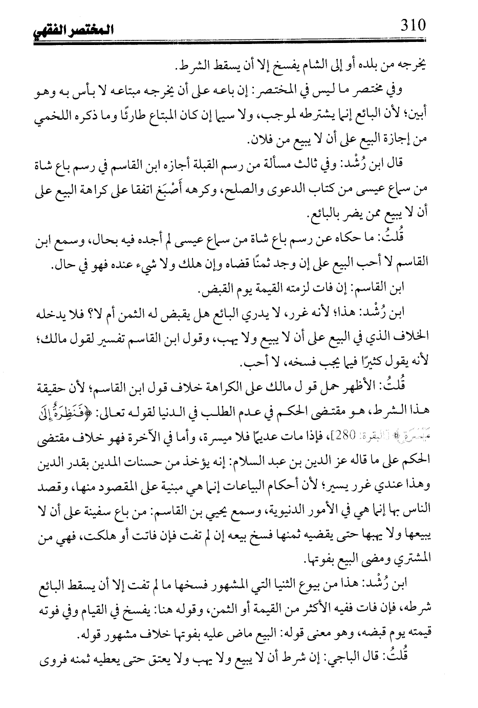 ابن زرقون: روايتها أنه بيع فاسد في فسخه وفوته وغلته، وعلى قول سَحنون، وابن الماجشُون وغيرهما: إنه سلف جر نفعًا، ترد الغلة للبائع وتقدم جعلها ابن رُشْد من جملة بياعات الشروط، وقال اللخمي في الموَّازية: من اشترى على ثنيا فأسقط البائع الشرط مضى البيع.