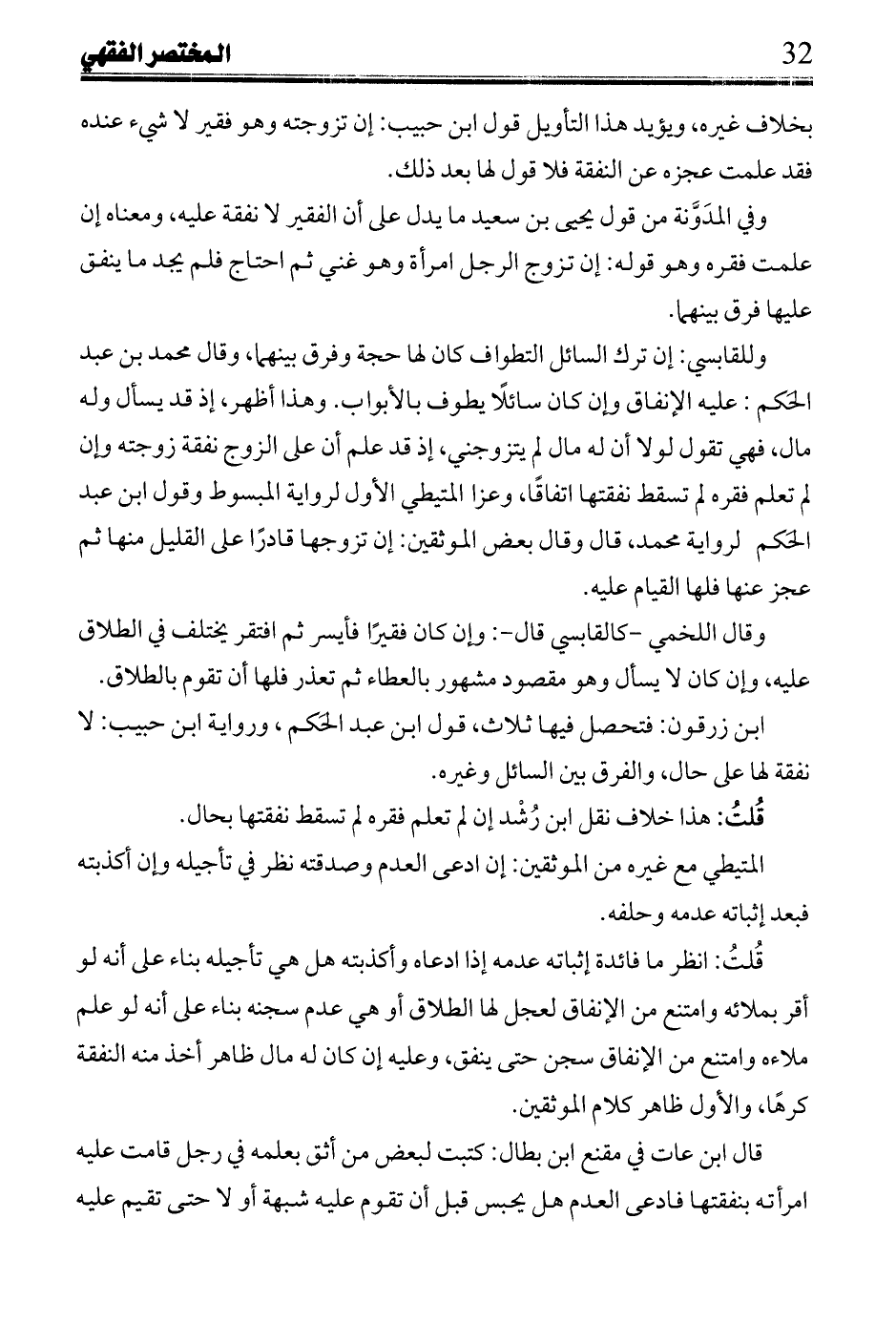 وللقباسي: إن ترك السائل التطواف كان لها حجة وفرق بينهما، وقال محمد بن عبد الحَكم لرواية محمد، قال وقال بعض الموثقين: إن تزوجها قادرًا على القليل منها ثم عجز عنها فلها القيام عليها.