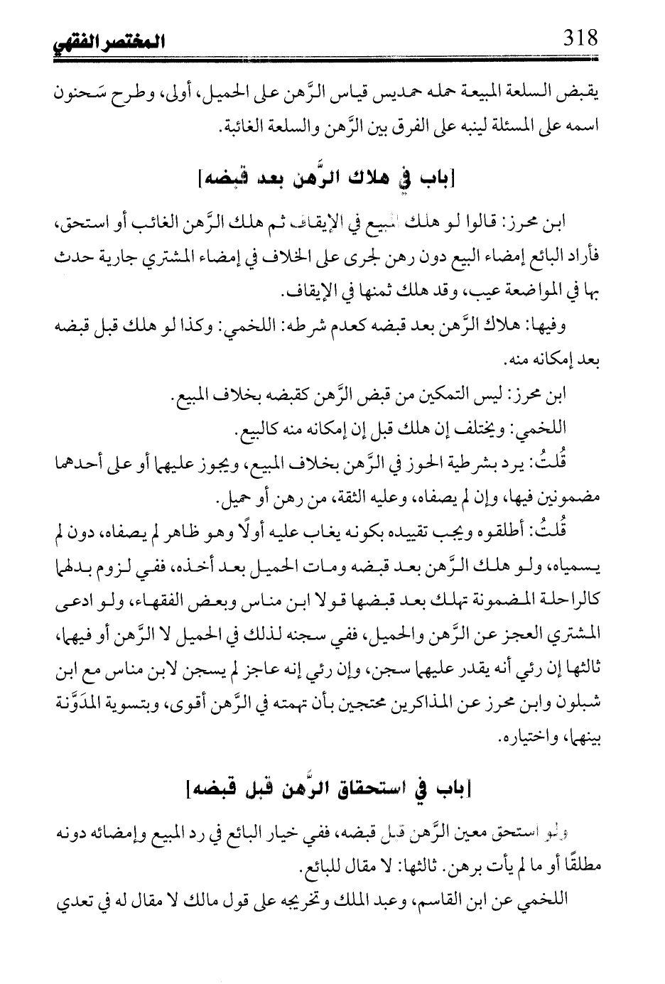 ابن رُشْد: هذه مسألة رديئة من مسائل المجالس لم يتدبر بيعها غير جائز؛ لأن ما يسترجعه المشتري من مناب باقي النفقة من الثمن هو تارة بيع، وتارة سلف، بسبب ما له أن يحدثه من بيع أو عتق، والبيع على هذا الشرط إن كان على أن يقبض المبتاع الصبي ويأخذ نفقته من البائع تلك المدة شهرًا شهرًا أو سنة سنة جاز البيع، ولم تسقط النفقة بموت الصبي، ولا بيعه ولا عتقه، وكان للمبتاع أخذه بها، وإن كان على أن يكون الصبي مع البائع يأكل معه كواحد من عياله لم يجز عند ابن القاسم إلا أن يكون على أنه إن مات أو باعه أو أعتقه أتاه بمثله ينفق عليه لتمام المدة على قوله فيها فيمن باع أمة على أن ترضع ابنًا لها سنة، جاز إن كان إن مات أرضع له آخر، وعلى أصله في الراعي يستأجر على رعاية غنم بأعيانها لا يجوز إلا بشرط الخلف وأجازه سَحنون مطلقًا، ولو قال البائع: شرطت كونه يأكل عندي يده مع يدي، وقال المبتاع: بل على أنه عندي أخذ نفقته شهرًا شهرًا تحالفا، وتفاسخا، وكذا إن ادعيا ذلك نيَّة تحالفًا على نياتهما، وفي قوله: أو يعتق المشتري الصبي نظر إذ لا تسقط النفقة عمن أعتق صغيرًا لا يقوم بنفسه.