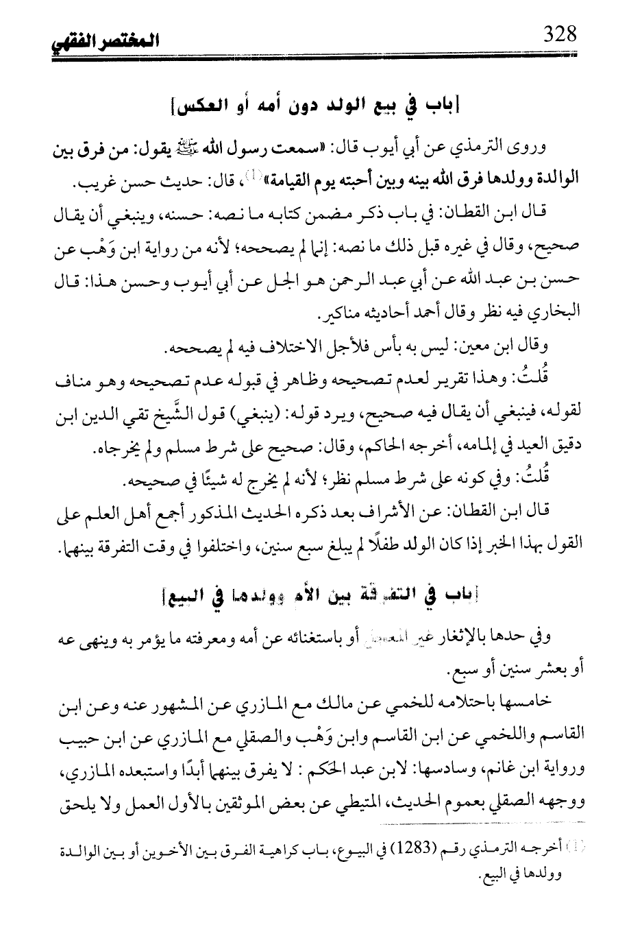 قُلتُ: هو نصها وفيها: من ابتاع أمة وولدها في ملكه وكان لابنه الصغير فلا يفرق بينهما في البيع.