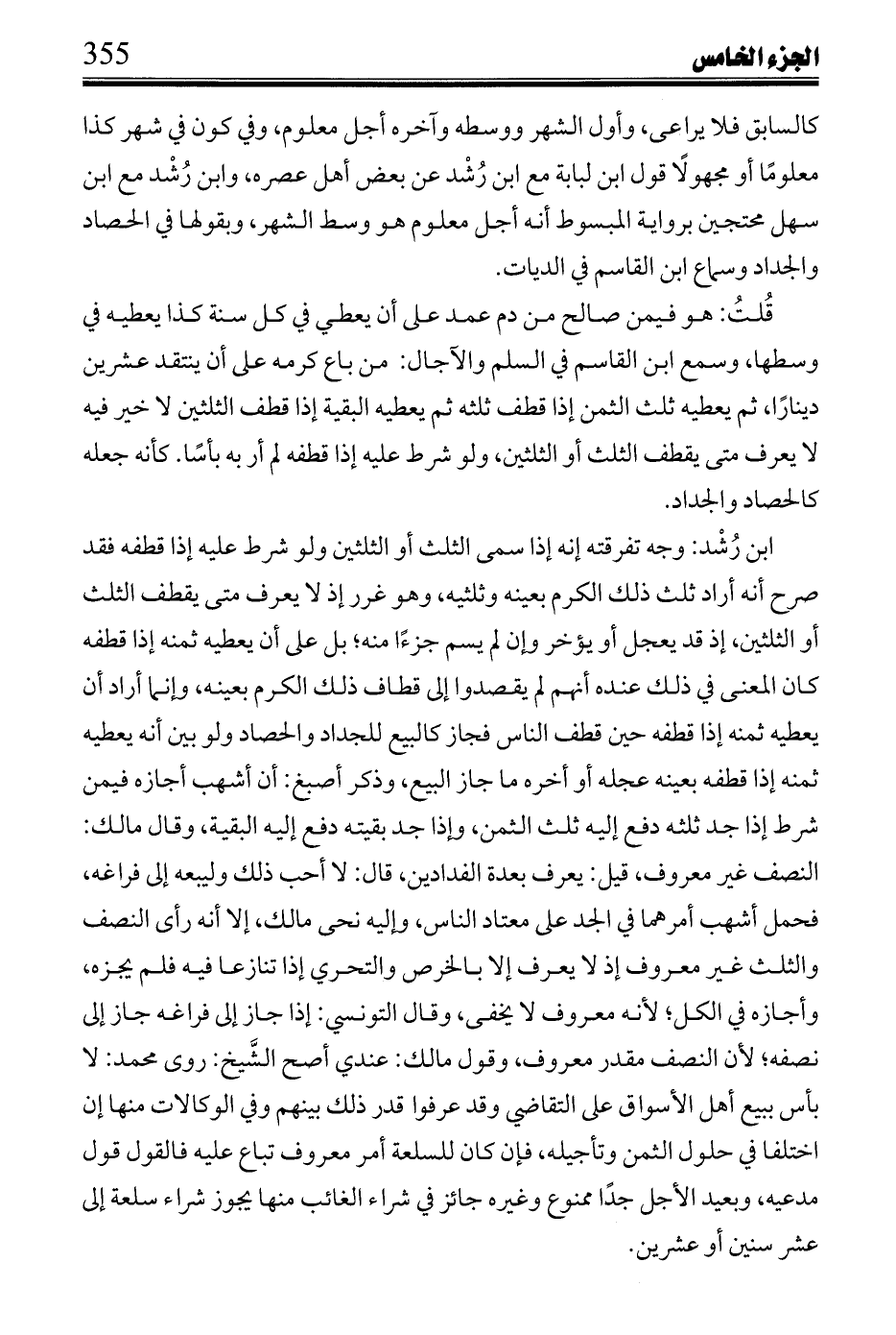 ضمير منها عائد على بيوع الآجال وذلك مانع من نقضه بمسائل الصرف، والاقتضاء من ثمن الطعام طعامًا إذا كان البيع نقدًا، فإذا كان إلى أجل فالنقض فيه ممنوع؛ بل هو من صور المعرف حسبما ذكره ابن رُشْد وغيره في جملة صور بياعات الآجال. وكان بعض الإسكندرانيين أورد أسئلة على مواضع من كلام ابن عبد السلام وبعث بها إليه زمن قراءتي عليه فطلبني بالجواب عن الأسئلة فأجبت عنها فنظرها، وبعث بها مع جالبها إليه منها سؤاله عما يعود عليه ضمير منها قال ما حاصله: إما أن يعود على صور أو على بيوع الآجال لا يخلو عن أحدهما وكلاهما باطل، أما الأول فلأنه تحصيل الحاصل فكان حشوًا، وأما الثاني فلإيجابه الدور؛ لأنها المعرف، وفهم الضمير متوقف على فهم ما يعود عليه وهو المعرف فالتعريف متوقف على فهم المعرف، وكان جوابه منع لزوم الدور لجواز عوده على بيوع الآجال من حيث المعنى الإضافي لا اللقبي، فهو من باب عندي درهم ونصفه ومما أنشد عليه سيبويه: