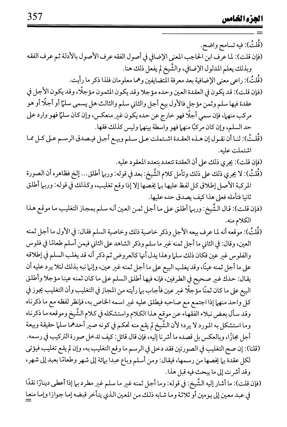 قُلتُ: وقوله: وهي ضعيفة، إلى قوله: التعبدات حاصله أن التمسك بمنع البيع والسلف إنما هو بناء على عدم تعلق حكم المنع بالذوات، ولا دليل عليه، يرد بأنه إن أراد بقوله: على عدم تعليق الحكم بالذوات أنه بناء عليه ولو لم يقم دليل على كون الحكم معللًا، فواضح بطلانه؛ لأن الدليل المذكور إنما هو بناء على أنه معلل حسبما نص عليه المازري وابن شاس، وغيرهما، وإليه أشار ابن الحاجب بقوله: ولا معنى سواه وإن أراد أنه بناء عليه مع قيام الدليل على كون الحكم معللًا، فقوله: لا دليل عليه ةهم لا يليق به ولا بمن تصور أدنى كلام في القياس في أصول الفقه وقوله: وإن قام عليه دليل فهو منقوض بالتعبدات، قوله: إن قام الدليل على عدم تعلق الحكم بالذوات فهو منقوض بالتعبدات وهم واضح؛ لأن الدليل القائم على ذلك إنما هو عند قيام الدليل على كون الحكم معللًا وبالضرورة أن التعبدات لا يصح النقض بها على الأحكام المعللة، وكلامه إنما يتصور على قول بعض الفقهاء: إن التعبدات هي الأحكام التي لا علة لها بحال، وهو ظاهر كلام ابن رُشْد في كتاب الصيام لا على قول أكثر الأصوليين: إنها الأحكام التي لم يقم على إدراك علتها دليل لا التي لا علة لها في نفس الأمر؛ بل كل حكم له علة في نفس الأمر ارتبط بها شرعًا تفضلًا لا عقلًا ولا وجوبًا قوله: لو سلم، إلى قوله: بالسلف يرد بأنه إن أراد بقوله حقيقة نصًا أو علمًا فلا خفاء في بطلانه، وليس كذلك، وإن أراد به ظنًا رد بالقول بموجبه؛ لأن المنع في صور بيوع الآجال إنما هو عند ظن حصول الوصف الموجب للمنع قوله: ويحققه إلى قوله: مطلقًا يرد بأن قوله: القول بالأكثر من القيمة أو الثمن والأقل منهما بناء على فساده بالذريعة، والقول بالقيمة مطلقًا بناء على أنه سلف جر نفعًا دعوى لا دليل عليها ولا مناسبة لها تنتج التفرقة المذكورة إذ لا مناسبة بين كون الفساد للذريعة والحكم بالأقل من القيمة أو الثمن وإنما القولان بناء على إلزام أحدهما ما التزمه في العقد من رضاه، بما هو أقل من القيمة أو بما هو أكثر منها لقاعدة أن من التزم شيئًا فقد لزمه، وعدم التزامه؛ لأنه إما التزمه في عقد بطل لفساده فيبطل بطلان محله، ولذا اختلفوا لو غاب على السلف