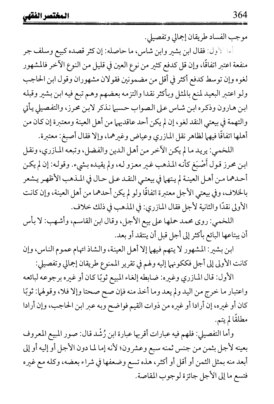 قُلتُ: عزا ابن محرز الأولى لأكثر الأشياخ والثانية لبعضهم، ولما جعل اللخمي ما تقدم من التهمة على المبادلة قال: وأما المراطلة فلابن القاسم وعبد الملك إن باعها بعشرة عتق إلى شهر ثم اشتراها بعشرة هاشمية نقدًا هي بزيادة عددها مثل العتق أو أكثر فلا بأس وإلا فلا خير فيه، ولو نقصت العتق خروبة خروبة والهاشمية رديئة وازنة، فإن كان في زيادة وزنها ما يحمل وجوه العتق فأكثر جاز وإلا فلا، وهذا خلاف منع ابن القاسم المحمدية باليزيدية، والمنع في المراطلة أقوى؛ لأنها مبايعة، المبادلة تفضل من صاحب المحمدية، وجواز الجميع أحسن؛ لأن التهمة في بيوع الآجال أن يقدم قليلًا في كثير، وفي لغو التهمة على صرف مؤخر، ثالثها إن بان فضل المعجل على المؤخر كشراء ما بيع بأربعين درهمًا لشهر بعشرين دينارًا نقدًا، لتخريج اللخمي على قول ابن القاسم مع عبد الملك ونقله عن أشهب وابن القاسم فيها، ونقل التونسي والمازري كاللخمي، وجعل ابن بشير الأول نصًا ولم يعزه.