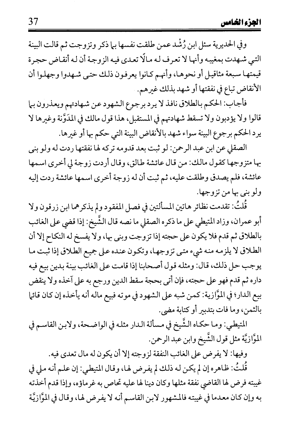 وفي الحديرية سئل ابن رُشْد عمن طلقت نفسها بما ذكر وتزوجت ثم قالت البينة التي شهدت بمغيبه وأنها لا تعرف له مالاً تعدى فيه الزوجة أن له أنقاض حجرة قيمتها سبعة مثاقيل أو نحوها، وأنهم كانوا يعرفون ذلك حتى شهدوا وجهلوا أن الأنقاض تباع في نفقتها أو شهدوا وجهلوا أن الأنقاض تباع في نفقتها أو شهد بذلك غيرهم.