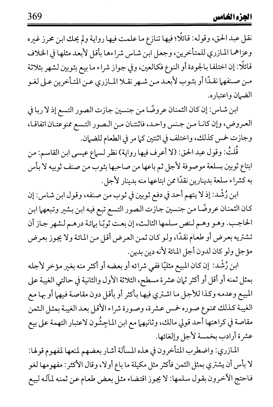القاسم مرة في كتاب الصرف أنهما مما تختلف فيهما الأغراض فيمنع للتفاضل إن أخذ أدنى وللنساء إن أخذ مثل المكيلة، ورأى مرة أن المحمولة أدنى فيختلف هل يتهمان على الضمان بجعل حسبما تقدم، وإن أخذ تمرًا أو قطنية فالمعروف لا يجوز، وتجري على القول في بيوع الآجال أجاز ابن القاسم في المدَوَّنة لمن باع ثوبًا بدرهم لأجل شراؤه بدنانير نقدًا إن كانت الدنانير أقل من الأولى بالشيء البين وأجاز مع عبد الملك في المجموعة: إن كانت الدنانير مثل صرف الدراهم بالنقد يوم البيع الأول؛ لأنه يخسر الصبر فجعل التهمة فيما يعود بزيادة فعلى قوله في المدَوَّنة: إن كان ثمن ما أخذ أخيرًا أقل من الأول باشيء البين جاز، إذ لا تهمة فيه وعلى قوله في المجموعة: يجوز إن كانت قيمة الطعام الثاني مثل قيمة الأول يوم وقع البيع، ويمنع إن كانت أكثر والمراعى وقيمة الطعامين يوم البيع الأول ولا يعتبر نقصها بعده، ومن باع ثمر حائطه رطبًا بدين لأجل ففي جواز أخذه إذا صار تمرًا ببعض ثمنه أو كله أو بأكثر منه، ومنعه ثالثها في التفليس ويختص به عن غرمائه لابن رُشْد عن أول قولي مالك ورواية أشهب مع رواية ابن حبيب وآخر قوليه.