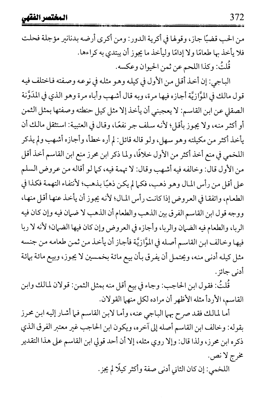 زاد الشَّيخ عن ابن حبيب: من باع طعامًا بثمن مؤجل فلا يأخذ فيه جبح نحل إذ لا تخلو من عسل إلا أن يكون فيه عسل لا يعتد به.