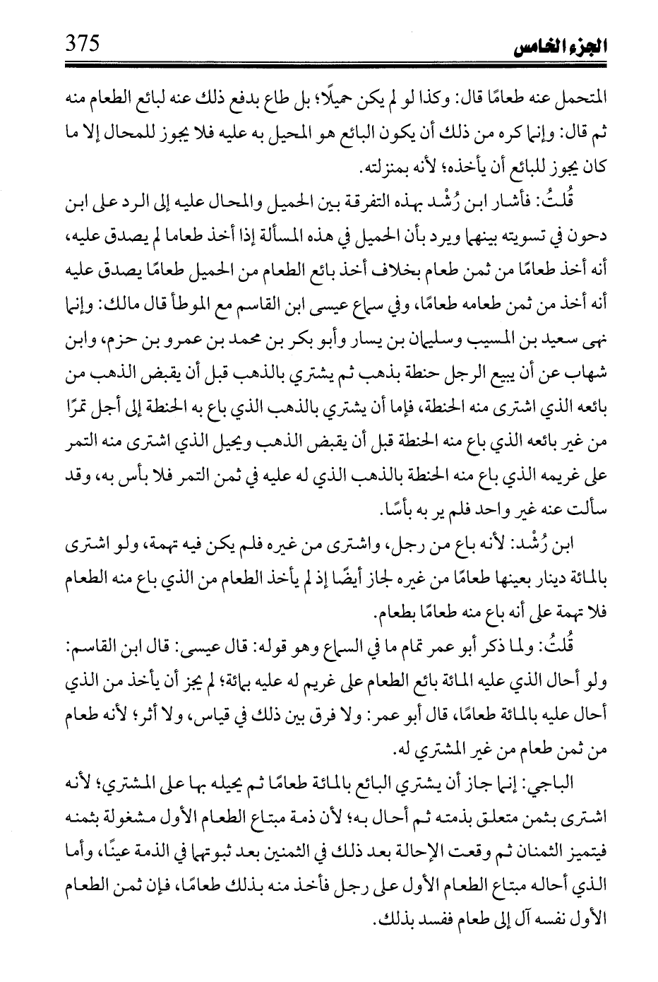 ابن رُشْد: رواية ابن القاسم وقعت في الموَّازية: من باع دابة أو بعيرًا بثمن إلى أجل فسافر بذلك مبتاعه لحج أو سفر بعيد فأتى به وقد نقص لا بأس أن يشتريه بأقل من ثمنه نقدًا، وذهب كل من ابن القاسم وأشهب في هذه المسألة إلى رواية فيها، وذلك من قولهما في رواحلها، أجاز ابن القاسم أن يستقبل الكري المتكاري بزيادة بعد قبض الكراء والغيبة عليه إن سارا من الطريق ما يرفع التهمة، ولم يجزه أشهب، وقول ابن القاسم وروايته أظهر، وكون ثمن المبيع الثاني مؤجلًا وكون مبيعه بعض الأول أو أكثر