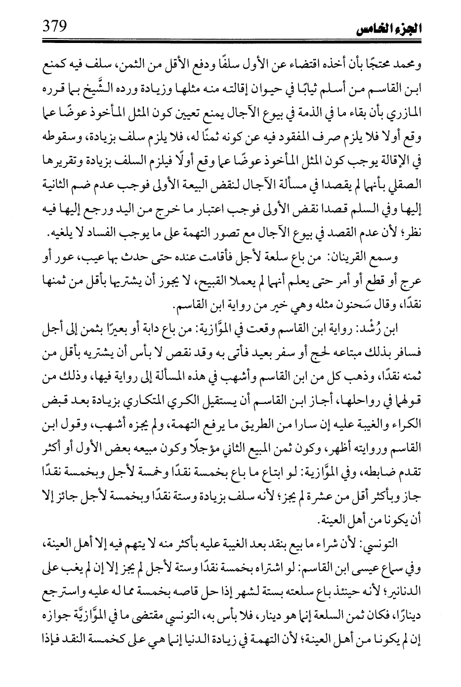ابن محرز: من المذاكرين من عارض هذا الوجه بأنه كما جاز أن يأخذ عن جميع الأثواب قبل الأجل عرضًا يجوز أن يسلم فيها، وإن لم يف بقيمتها ولا يكون (ضع وتعجل) فكذا إذا تعجل بعضها وعاوض عن بقيتها، وقوله: باطل؛ لأن الأخذ عن جميعها لا يبقى ما يتصور فيه تعجيل فلا يتصور كون الوضع له، والأخذ عن بعضها مع تعجيل باقيها يوجبه كون التعجيل للوضيعة.