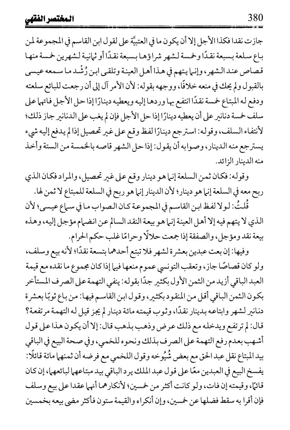 قُلتُ: فل أخرت أو عجلت فأحرى في المنع. ابن بشير: لو أبقى الثياب لأجلها والمعجل عين فرسه جاز، ولو أخر بها لم يجز اتفاقًا فيهما لحقيقة البيع والسلف، وقول ابن الحاجب: إن كان المزيد مؤخرًا عن الأجل منع؛ لأنه دين بدين وبيع وسلف محقق، وإن كان إلى مثله جاز متعقب بأنه إن أراد أن المزيد مثل المسلم فيه لم يكن دينًا بدين؛ بل محض سلف قارنه بيع وإن أراد أنه ليس مثله بطل، قوله: إن كان لمثله جاز؛ لأنه دين بدين، وجواب ابن عبد السلام بإرادة الأول قال: ويحتمل كون الباقي عما يعدل المعجل أقل من المزيد بعد الأجل ففسخه فيه فسخ دين في دين؛ لأنه دفع أقل في أكثر بعيد؛ لأن عباراتهم في التعليل بمثل هذا إنه سلف بزيادة لا فسخ دين في دين، وفيها لربيعة: من أقال من حمار ابتاعه بعشرة دنانير لأجل على إن عجل منها دينارًا أو بهما نقدًا على إن أخر به لم يجز.