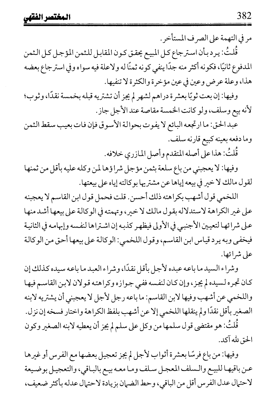 ابن محرز عن ابن القاسم وكذا إن كان الثمنان لأجل واحد من صنف واحد ولو كان أحدهما أكثر، ولو اختلف أجلهما أو صنفهما لم يجز، ويفسخ ثانيه ما فسد منها، وفي الأولى قولا ابن الماجِشُون، والمشهور وحمله اللخمي على من لم تكن عادتهم الفساد.