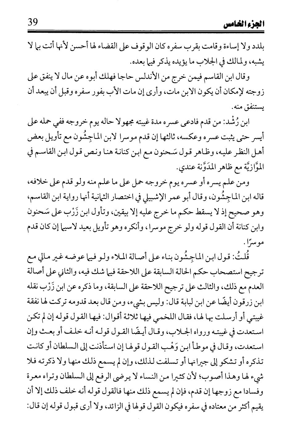 ابن رُشْد: من قدم فادعى عسره مدة غيبته مجهولا حاله يوم خروجه ففي حمله على أيسر حتى يثبت عسره وعكسه، ثالثها إن قدم موسرا لابن الماجِشُون مع تأويل بعض أهل النظر عليه، وظاهر قول سَحنون مع ابن كنانة هنا ونص قول ابن القاسم في الموَّازيَّة مع ظاهر المدَوَّنة عندي.