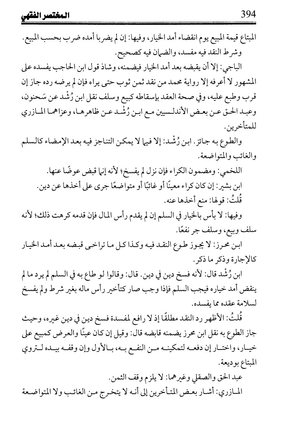 الصقلي: قول بعض أصحابنا يحتمل قول ابن القاسم يضمن الثمن، أي: القيمة، أو أنه اختار قبل ذلك خلاف ظاهر الكتاب.