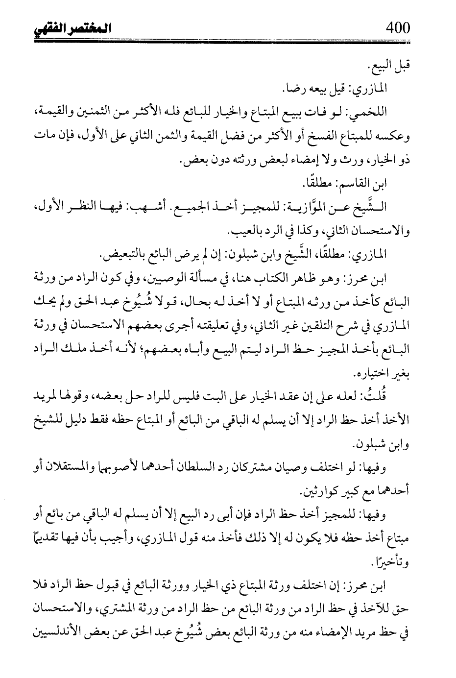 ابن محرز: إن حدث بها عنده عيب فله إمساكها بقيمتها يوم قبضها بالعيبين وردها بغرم نقص الثالث من قيمتها بها ووجه قول أشهب بأن فوتها يعلقها بذمة المشتري كإتلافه إياها قال: والأول قال: والأول أصح؛ لأن فوتها يوجب أن قيمتها كثمن لها بالعيبين معًا، ومبتاع شيء بخيار إن رده فأنكر البائع أنه المبيع صدق مبتاعه مع يمينه، وبيع الاختيار وفروعه يأتي إن شاء الله حيث ذكره ابن الحاجب، والله الموفق.
