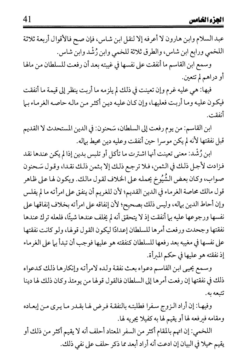 ابن رُشْد: معنى تعينت أنها اشترت ما تأكل أو تلبس بدين إذا لم يكن عندها نقد فزادت لأجل ذلك في الثمن، فلا ترجع ذلك إلا بثمن ذلك نقدا، وقول سَحنون صواب، وكان بعض الشُيُوخ يحمله على الخلاف لقول مالك. ويكون لها على ظاهر قول مالك محاصة الغرماء في الدين القديم؛ لأن للغريم أن ينفق على امرأته ما لم يفلس وإن أحاط الدين بماله، وليس ذلك بصحيح؛ لأن إنفاقه على امرأته بخلاف إنفاقها على نفسها ورجوعها عليه بما أنفقت إذ لا يتحقق أنه لم يخلف عندها شيئًا، فلعله ترك عندها نفقتها وجحدت ورفعت أمرها للسلطان إعدادًا ليكون القول قولها، ولو كانت نفقتها على نفسها في مغيبه بعد رفعها للسلطان كنفقته هو عليها فوجب أن تبدأ بما على الغرماء إذ نفقته هو عليها في حكم المبرأة.