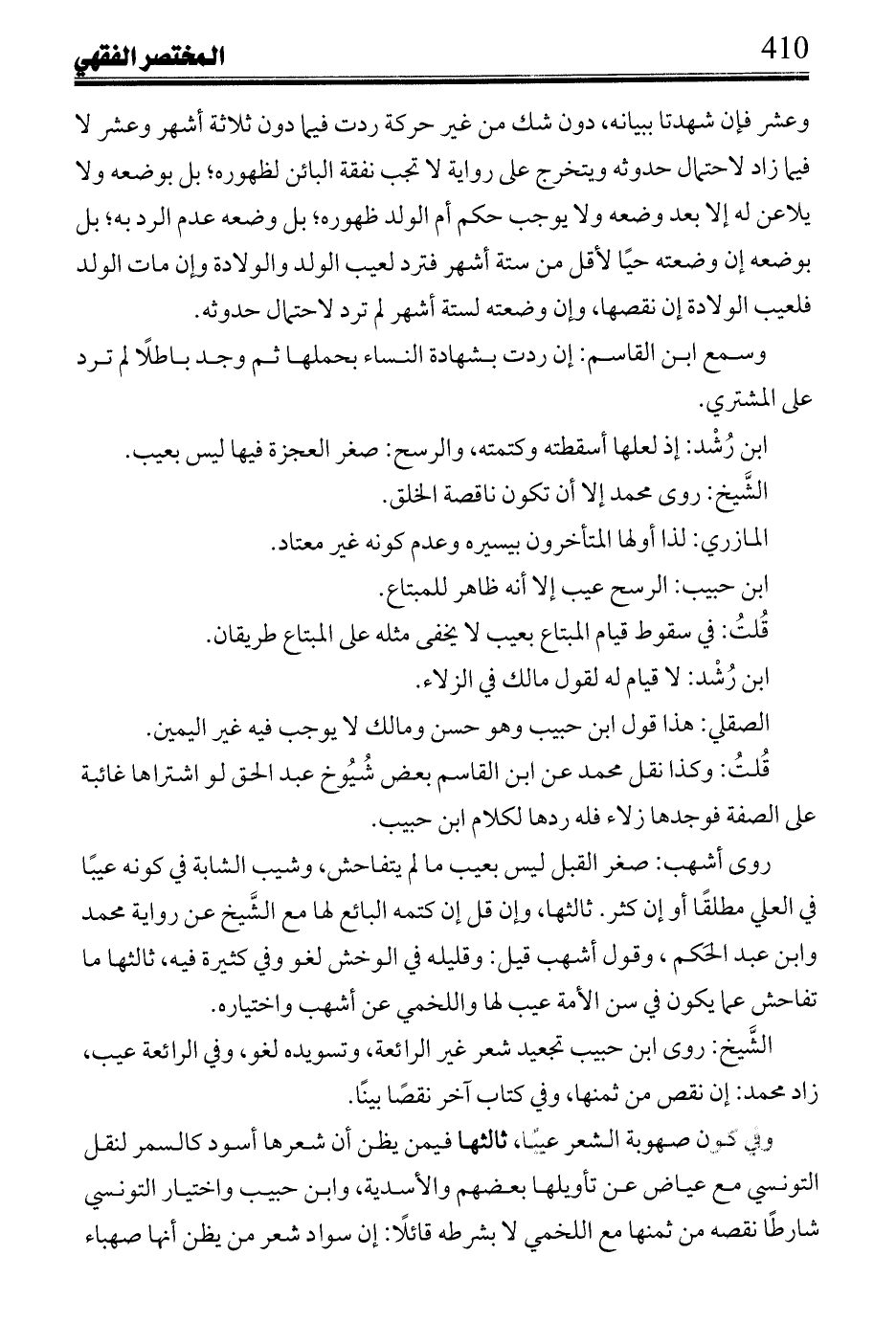 ثالثها: في الغلام مطلقًا، وفي الجارية الرفيعة لابن حبيب مع سماع محمد بن خالد ابن القاسم وسماعه عيسى وقياس ابن رُشْد بكونه قولًا ثالثًا، وفي كون خنتان العبد النصراني عيبًا قول ابن رُشْد مع سماع يحيي ابن القاسم وسماعه عيسى مع الشَّيخ عن الموَّازيَّة والواضحة.