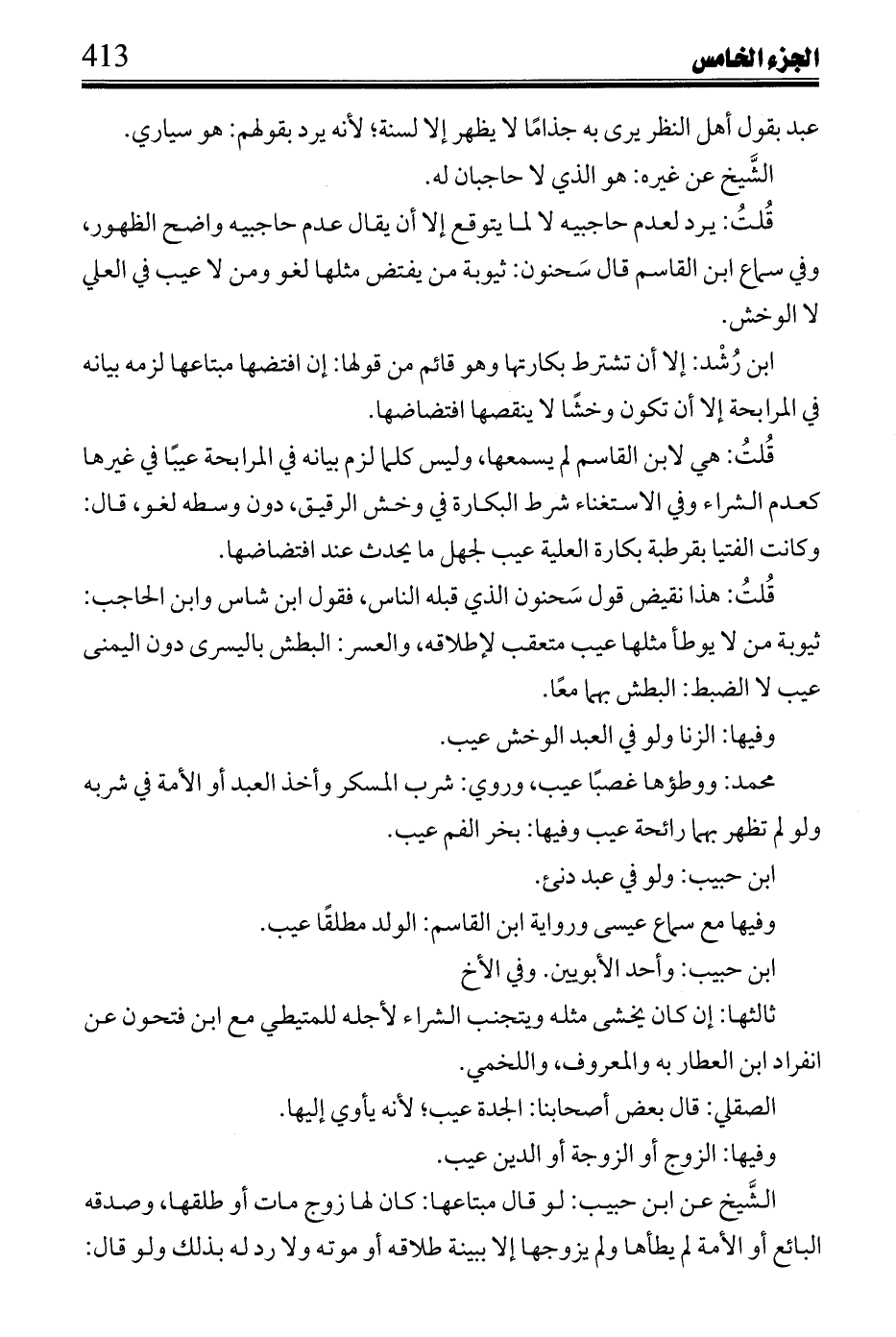 قُلتُ: يتهم على الرجوع بقيمة العيب قال: ولو شرطه وعلم قبل عتقه فله رده، وبعده سمع ابن القاسم مالكًا وابن هرمز: هو عيب يرجع به المبتاع فيأخذه من الثمن، ففسره ابن القاسم برجوعه بمناب عيب شرط العتق من الثمن كمناب عيب الدين والزوجة والولد.