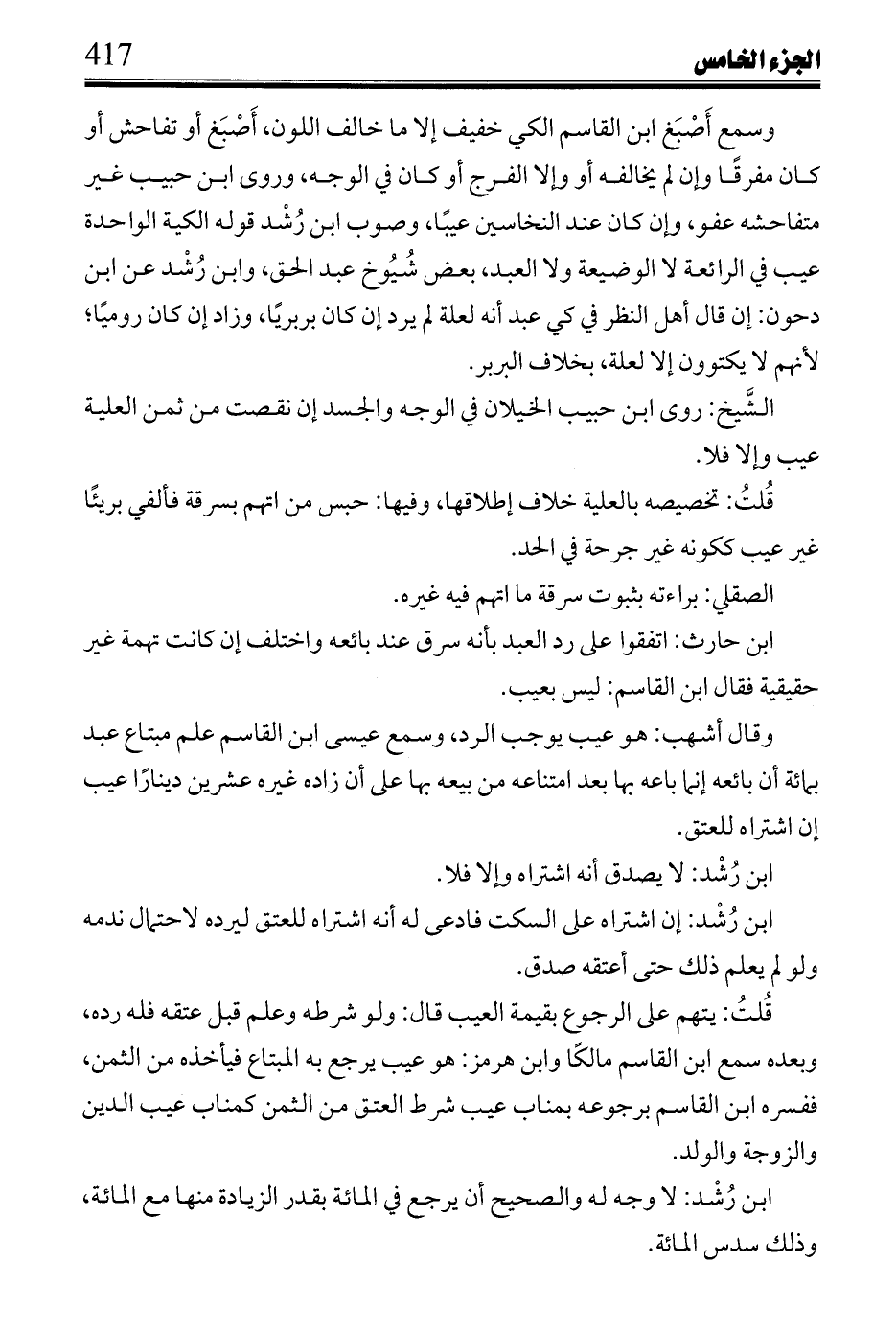 فيتبين أن السوس قد ساس فيها ولم يلبث عنده ما تسوس فيه؛ لأنها عند البيع مقبضة يابسة لا يستطاع تقليبها، او قد تكون غير مقبضة والسوس بين الجلد والصوف فإذا دبغت علم ذلك وكذا الجلود البقرية كذا فسره ابن الماجِشُون وأَصْبَغ زاد أصبغ: وفساد لون الحرير يظهر بعد إدخاله العمل إن كان أصلى الله عليه وسلما لا يحدث بعد تمامه وهو في يد أهله لا يرد به، وإن عرفه بصراء التجارة رد به.
