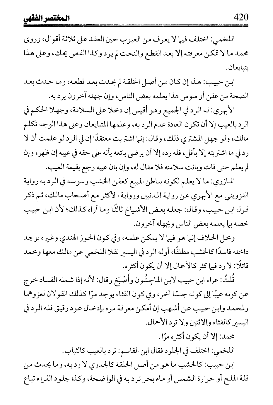 قُلتُ: أشار بنحوه على ابن عتاب لقوله في طي بئر تهيأ للسقوط بتعفن مائدته هو عيب، رد اللخمي: إن كان الحائط يلي دار البائع رد له ورجع المبتاع عليه بما بين قيمتها به وقيمتها دونه على أنه سترة لبائعها قال: وما كان عيبًا شاملًا رد به ولو قل ما ينوبه كاستحقاق ما جلها أو مطمر أو سقوفها أو قناة تشقها.