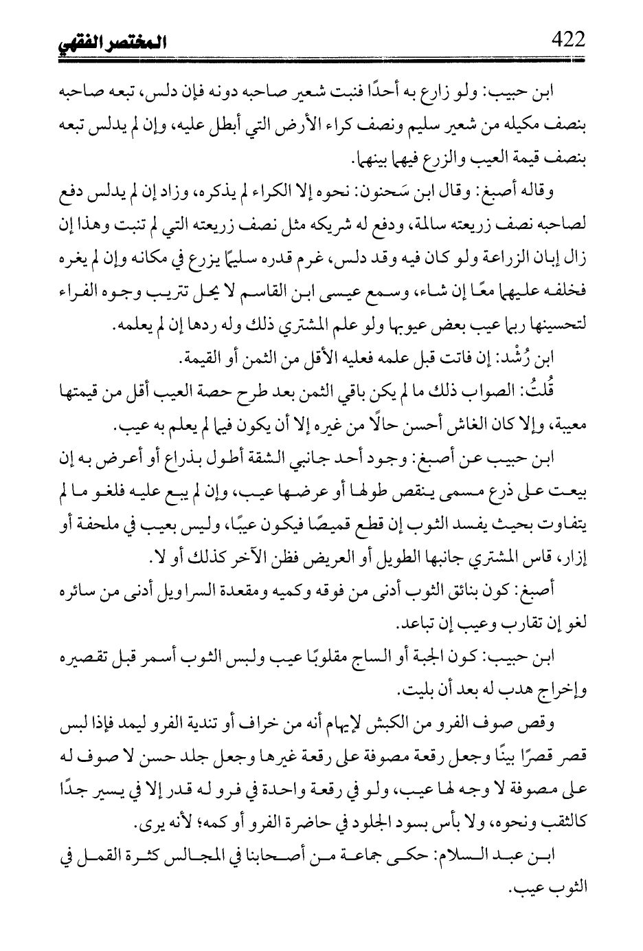 وبين مضى ولا رد للمبتاع وقد أساء فليس في قوله: أرى أن يبين إذا باع دليل على إباحته؛ بل معناه لزومه للمبتاع إن بين له؟ ويلزمه أن يبين قدر كل منهما إن علمه وإلا أخبر باختلاطهما وروى محمد كراهة من خلط قمحًا بشعير لقوته وفضل له منه فضل أن يبيعه وإن قل ثمنه، وخففه ابن القاسم إن لم يتعمد خلطه للبيع، وقاله الأخوان وإنما يرد المبتاع اللبن المخلوط والزبد والسمن إذا لم يكن غالب البلد أدناهما.