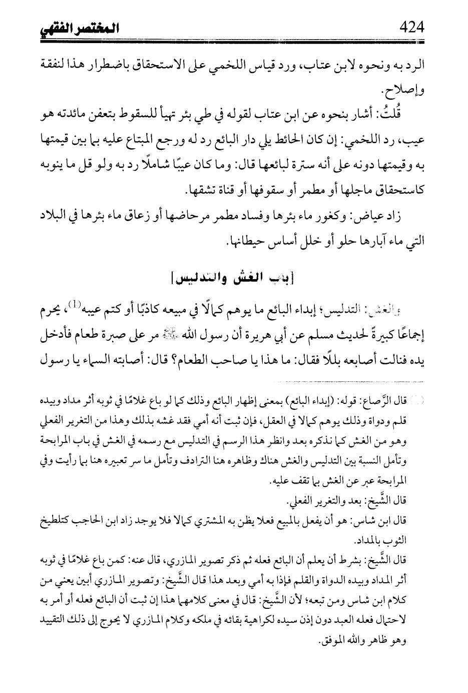 قُلتُ: هذا إن ثبت أن البائع مع فعله أو أمر به لاحتمال فعله العبد دون علم سيده لكراهة بقائه في ملكه وتصويره المازري أبين، قال: كما باع غلامًا في ثوبه أثر المداد وبيده الدواة والقلم فإذا به أمي قلت. ومنه قولها في البيوع الفاسدة: من ابتاع ثيابًا،
