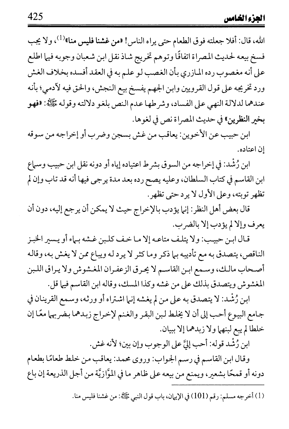 قُلتُ: يجب أن لا يردها بعد إمساكها لما ذكر إلا بعد حلفه أنه ما أمسكها إلا لذلك إلا أن يشهد بذلك قبل إمساكها قال: وإن اشتراها عالمًا أنها مصراة فلا رد له إلا أن يجدها دون معتاد مثلها، وإذا رد للتصرية ففي لغو لبنها ورد صاع بدله سماع القرينين والمشهور بناء على نسخ حديث المصراة بحديث: «الخروج بالضمان» وتخصيصه به.