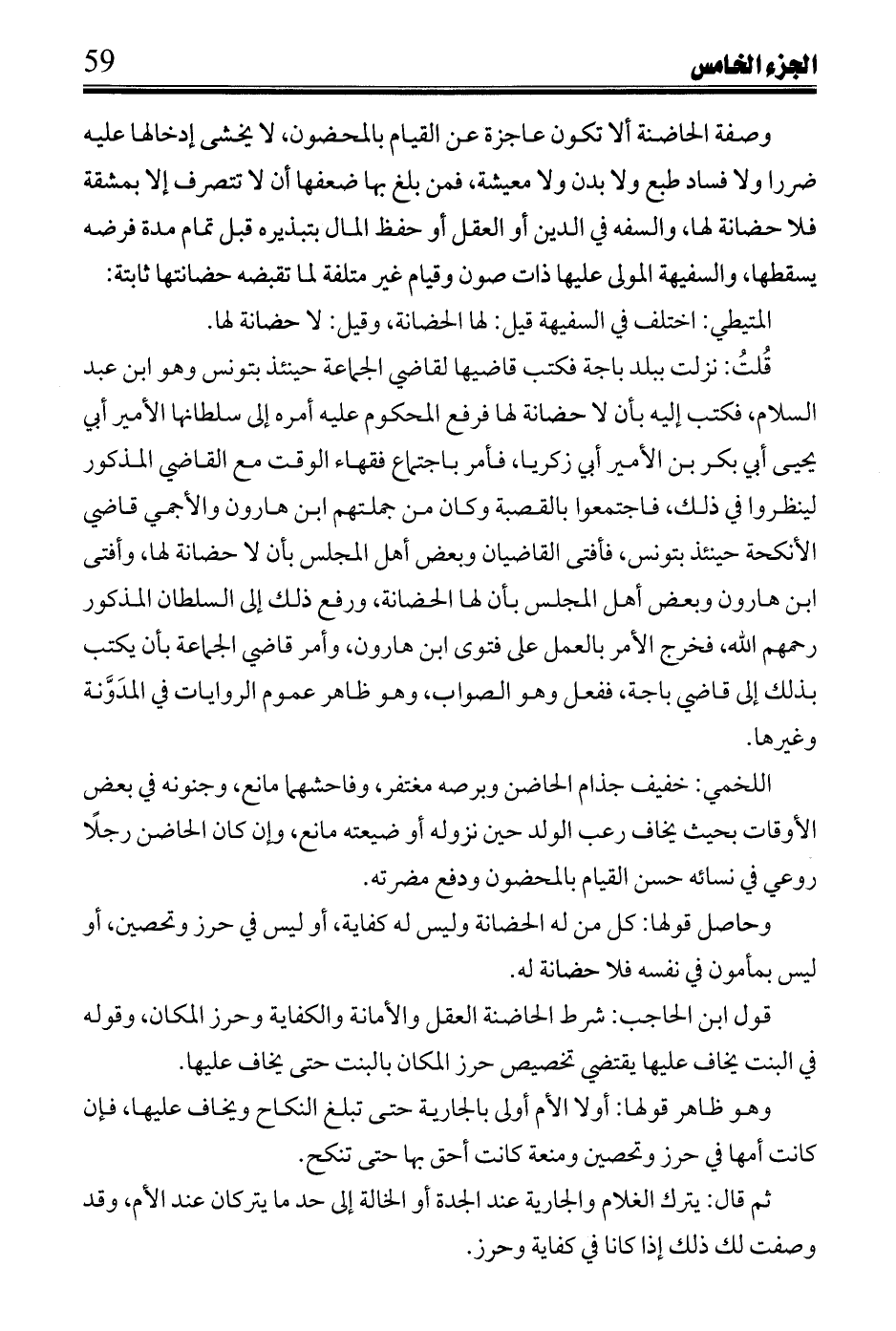 قُلتُ: نزلت ببلد باجة فكتب قاضيها لقاضي الجماعة حينئذ بتونس وهو ابن عبد السلام، فكتب إليه بأن لا حضانة لها فرفع المحكوم عليه أمره إلى سلطانها الأمير أبي يحيى أبي بكر بن الأمير أبي زكريا، فأمر باجتماع فقهاء الوقت مع القاضي المذكور لينظروا في ذلك، فاجتمعوا باقصبة وكان من جملتهم ابن هارون والأجمي قاضي الأنكحة حينئذ بتونس، فأفتى القاضيان وبعض أهل المجلس بأن لا حضانة لها، وأفتى ابن هارون وبعض أهل المجلس بأن لها الحضانة، ورفع ذلك إلى السلطان المذكور رحمهم الله، فخرج الأمر بالعمل علي فتوى ابن هارون وأمر قاضي الجماعة بأن يكتب بذلك إلى قاضي باجة، ففعل وهو الصواب، وهو ظاهر عموم الروايات في المدَوَّنة وغيرها.