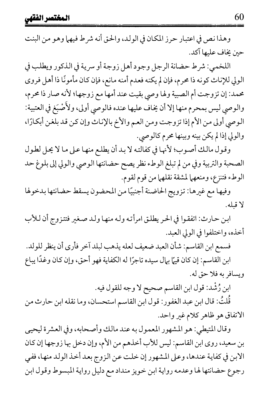 وقال المتيطي: هو المشهور المعمول به عند مالك وأصحابه، وفي العشرة ليحيى بن سعيد، روى ابن القاسم: ليس للأب أخذهم من الأم، وإن دخل بها زوجها إن كان الابن في كفاية عندها، وعلى المشهور إن خلت عن الزوج بعد أخذ الولد منها، ففي رجوع حضانتها لها وعدمه رواية ابن خويز منداد مع دليل رواية المبسوط وقول ابن